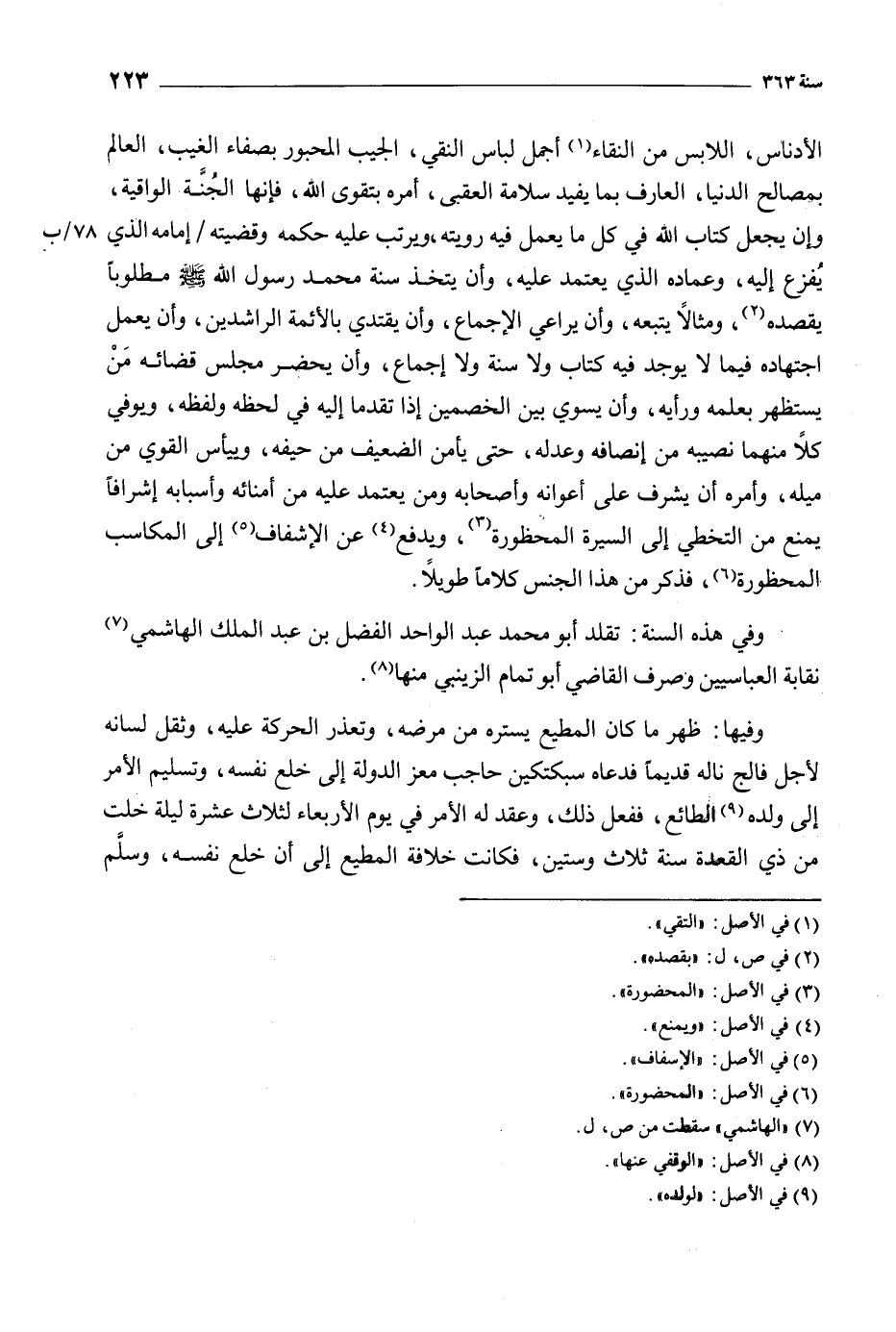 وفي هذه السنة: تقلد أبو محمد عبد الواحد الفضل بن عبد الملك الهاشمي [7] نقابة العباسيين وصرف القاضي أبو تمام الزينبي منها [8] .