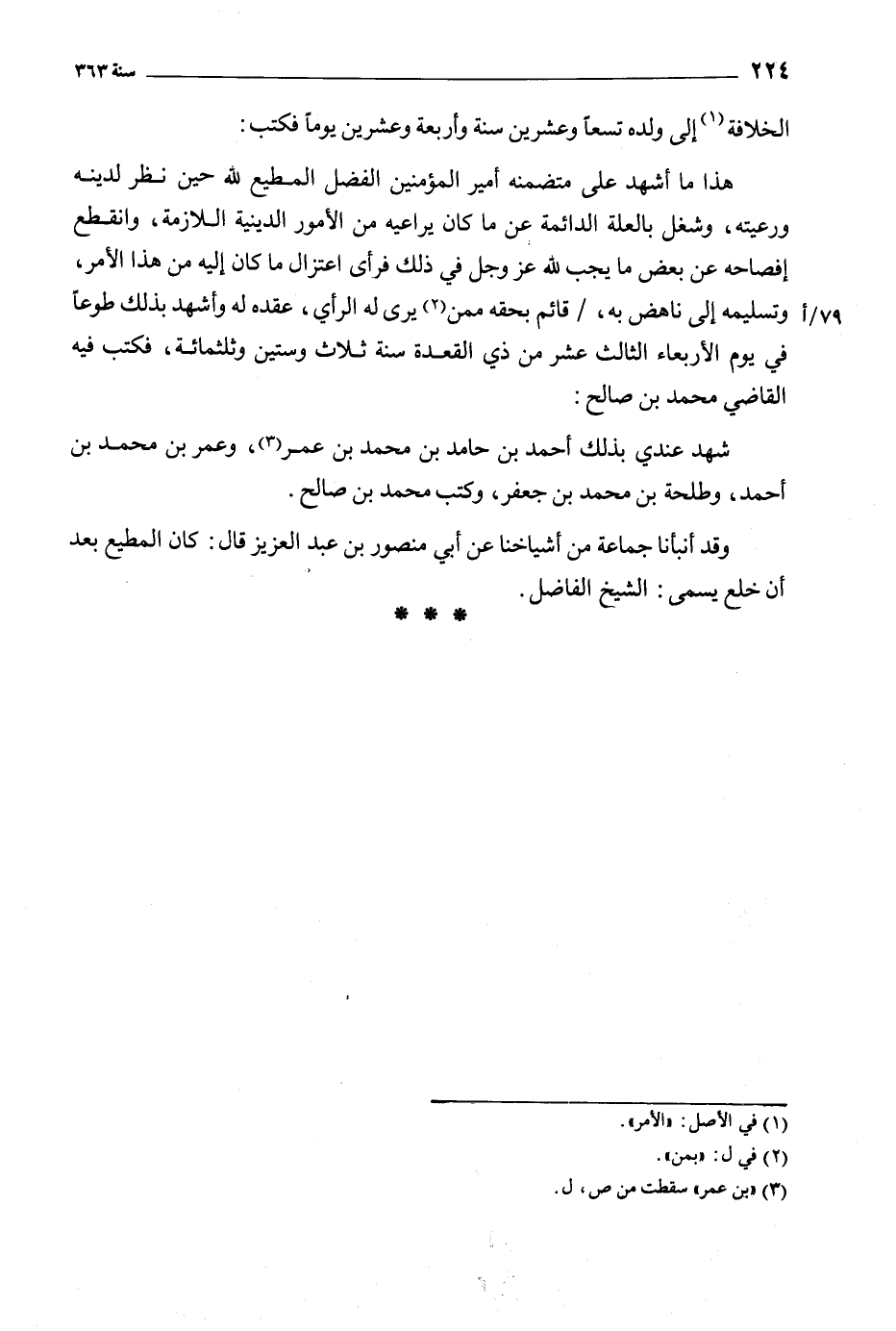هذا ما أشهد على متضمنه أمير المؤمنين الفضل المطيع للَّه حين نظر لدينه ورعيته، وشغل بالعلة الدائمة عن ما كان يراعيه من الأمور الدينية اللازمة، وانقطع إفصاحه عن بعض ما يجب للَّه عز وجل في ذلك فرأي اعتزال ما كان إليه من هذا الأمر، وتسليمه إلى ناهض به، / قائم بحقه ممن [2] يرى له الرأي، عقده له وأشهد بذلك طوعًا في يوم الأربعاء الثالث عشر من ذي القعدة سنة ثلاث وستين وثلاثمائة، فكتب فيه القاضي محمد بن صالح: