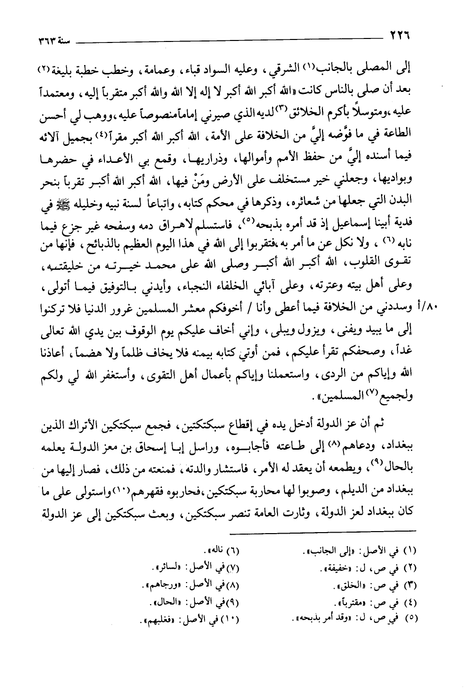 إلى المصلى بالجانب [1] الشرقي، وعليه السواد قباء، وعمامة، وخطب خطبة بليغة [2] بعد أن صلى بالناس كانت «اللَّهُ أَكْبَرُ اللَّهُ أَكْبَرُ لا إِلَهَ إِلا الله والله اكبر متقربا إليه، ومعتمدا عليه، ومتوسلا بأكرم الخلائق [3] لديه الذي صيرني إمامًا منصوصًا عليه، ووهب لي أحسن الطاعة في ما فوَّضه إليَّ من الخلافة على الأمة، الله أكبر الله أكبر مقرًا [4] بجميل آلائه فيما أسنده إلى من حفظ الأمم وأموالها، وذراريها، وقمع بي الأعداء في حضرها وبواديها، وجعلني خير مستخلف على الأَرْض ومن فيها، الله اكبر الله اكبر تقربا بنحر البدن التي جعلها من شعائره، وذكرها في محكم كتابه، واتباعًا لسنة نبيه وخليله صلى الله عليه وسلم في فدية أبينا إسماعيل إذ قد أمره بذبحه [5] ، فاستسلم لاهراق دمه وسفحه غير جزع فيما نابه [6] ، ولا نكل عن ما أمر به، فتقربوا إلى الله في هذا اليوم العظيم بالذبائح، فإنها من تقوى القلوب، الله أكبر الله أكبر وصلى الله على محمد خيرته من خليقته، وعلى أهل بيته وعترته، وعلى آبائي الخلفاء النجباء، وأيدني بالتوفيق فيما أتولى، وسددني من الخلافة فيما أعطى وأنا/ أخوفكم معشر المسلمين غرور الدنيا فلا تركنوا إلى ما يبيد ويفنى، ويزول ويبلى، وأني أخاف عليكم يوم الوقوف بين يدي الله تعالى غدًا، وصحفكم تقرأ عليكم، فمن أوتي كتابه بيمنه فلا يخاف ظلمًا ولا هضمًا، أعاذنا الله وإياكم من الردى، واستعملنا وإياكم بأعمال أهل التقوى، واستغفر الله لي ولكم ولجميع [7] المسلمين» .