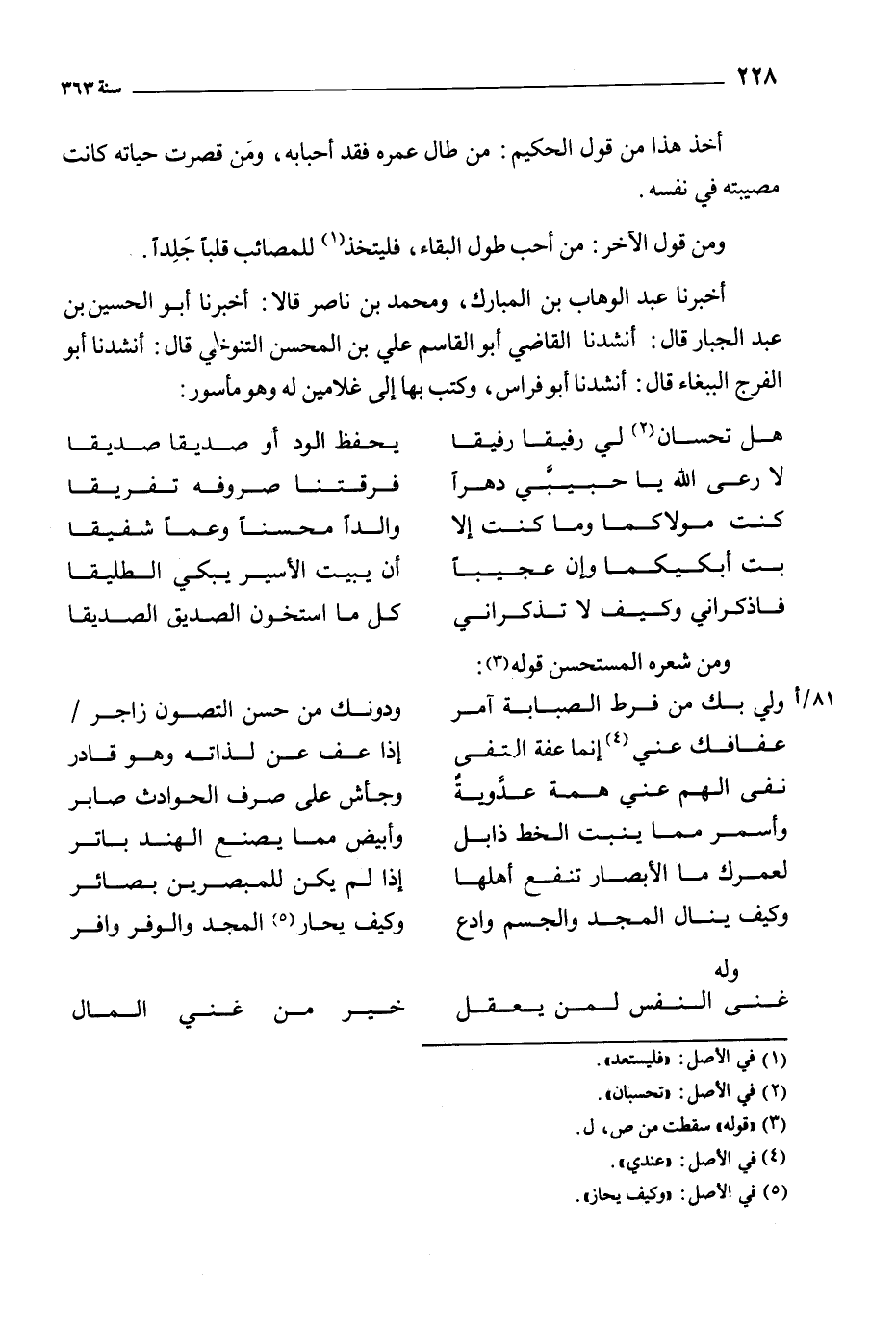 أخبرنا عبد الوهاب بن المبارك، ومحمد بن ناصر قالا: أخبرنا أبو الحسين بن عبد الجبار قال: أنشدنا القاضي أَبُو الْقَاسِمِ عَلِيُّ بْنُ الْمُحْسِنِ التَّنُوخِيُّ قَالَ: أنشدنا أبو الفرج الببغاء قال: أنشدنا أبو فراس، وكتب بها إلى غلامين له وهو مأسور: