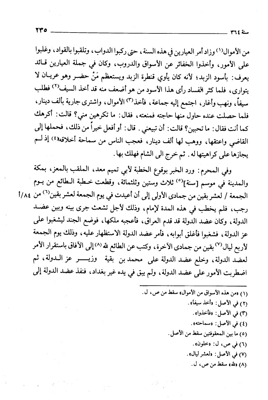 وفي المحرم: ورد الخبر بوقوع الخطبة لأبي تميم معد، الملقب بالمعز، بمكة والمدينة في موسم [سنة] [5] ثلاث وستين وثلاثمائة، وقطعت خطبة الطائع من يوم الجمعة/ لعشر بقين من جمادى الأولي إلى أن أعيدت في يوم الجمعة لعشر بقين [6] من رجب، فلم يخطب في هذه المدة لإمام، وذلك لأجل تشعث جرى بينه وبين عضد الدولة، وكان عضد الدولة قد قدم العراق، فأعجبه ملكها، فوضع الجند ليشغبوا على عز الدولة، فشغبوا فأغلق أبوابه، فأمر عضد الدولة الاستظهار عليه، وذلك يوم الجمعة لأربع ليال [7] بقين من جمادى الآخرة، وكتب عن الطائع للَّه [8] إلى الآفاق باستقرار الأمر لعضد الدولة، وخلع عضد الدولة على محمد بن بقية وزير عز الدولة، ثم اضطربت الأمور على عضد الدولة، ولم يبق في يده غير بغداد، فنفذ عضد الدولة إلى