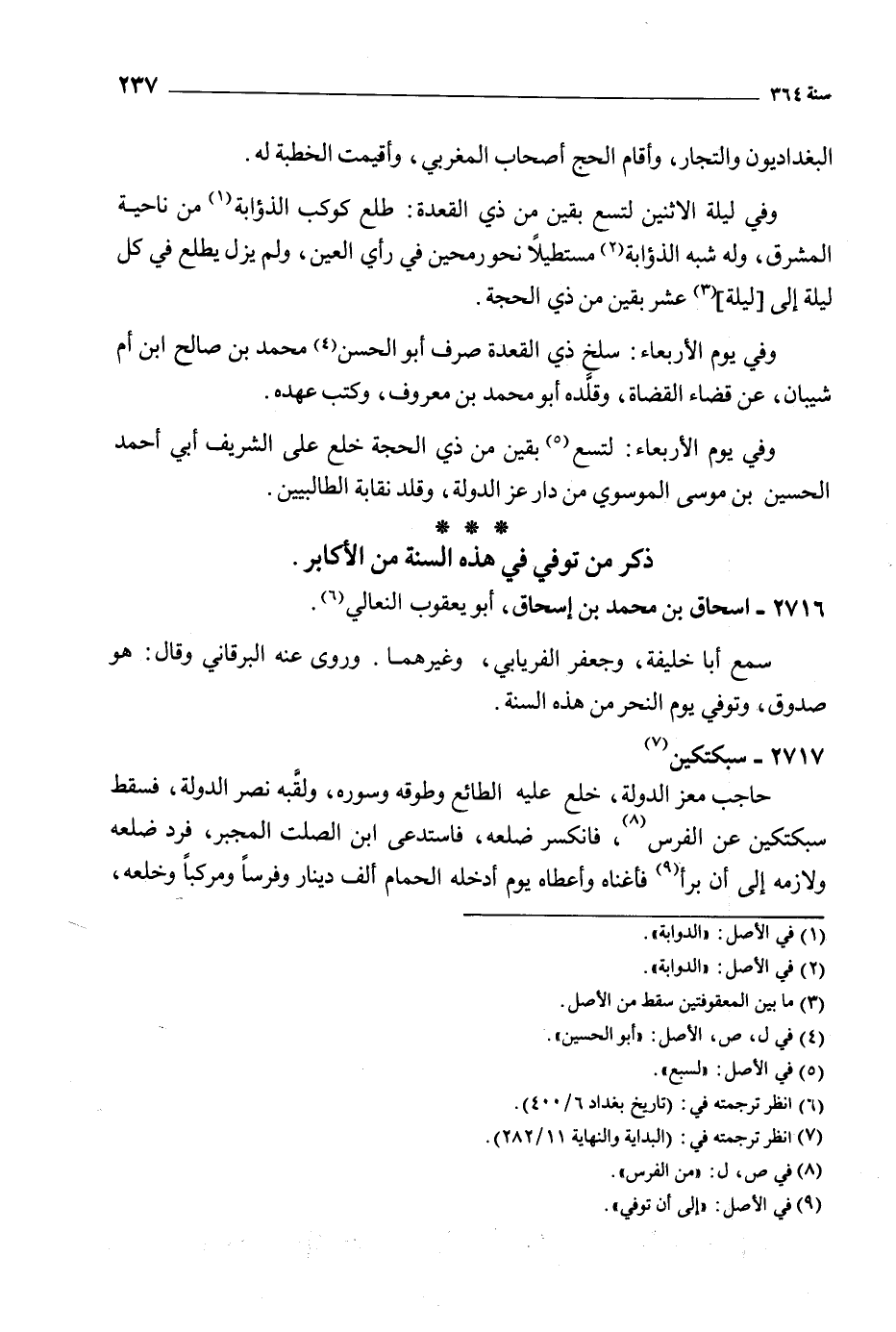 وفي يوم الأربعاء: لتسع [5] بقين من ذي الحجة خلع على الشريف أبي أحمد الحسين بن موسى الموسوي من دار عز الدولة، وقلد نقابة الطالبيين.