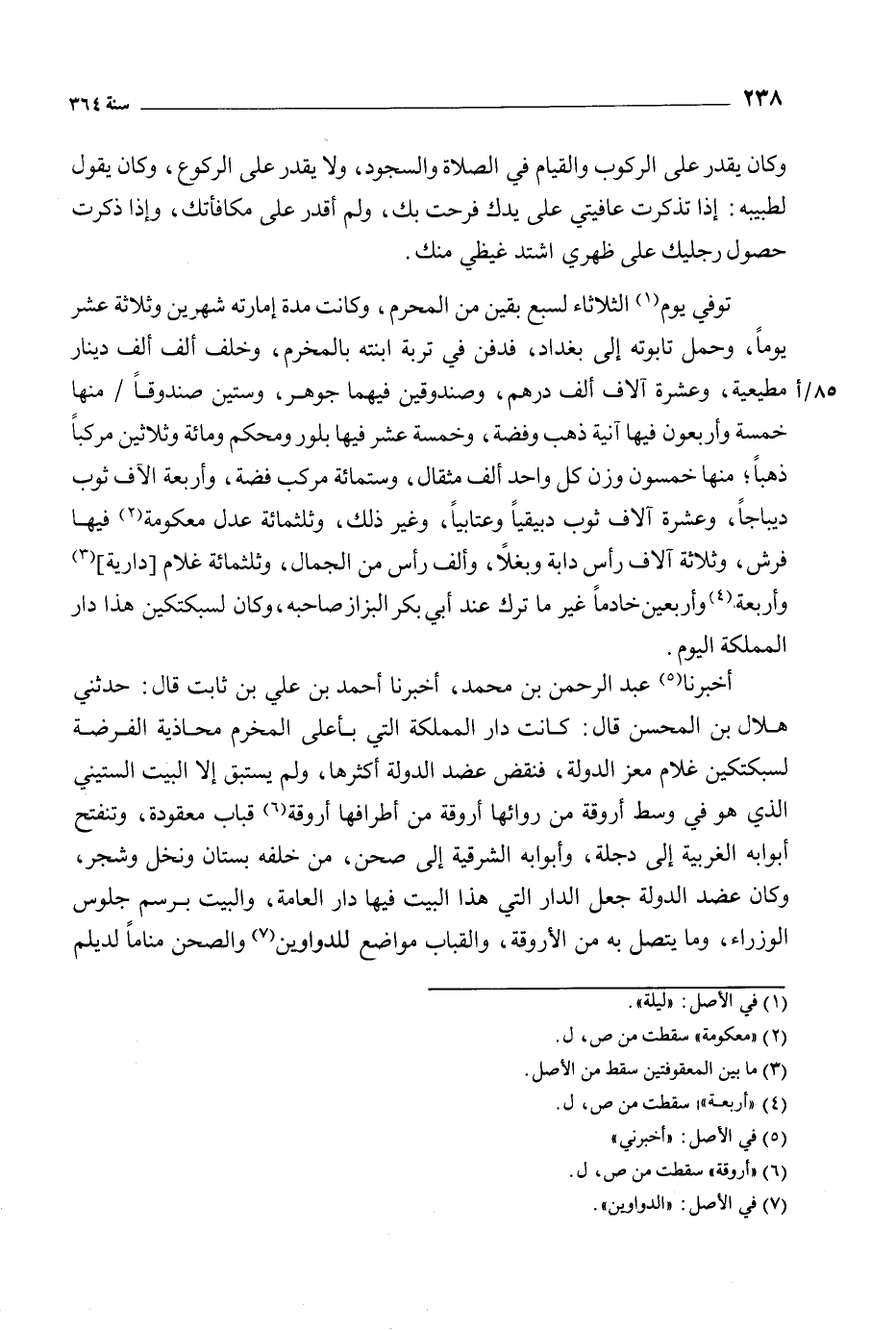 أَخْبَرَنَا [5] عَبْدُ الرَّحْمَنِ بْنُ مُحَمَّدٍ، أَخْبَرَنَا أَحْمَدُ بن علي بن ثابت قال: حدثني هلال بن المحسن قال: كانت دار المملكة التي بأعلى المخرم محاذية الفرضة لسبكتكين غلام معز الدولة، فنقض عضد الدولة أكثرها، ولم يستبق إلا البيت الستيني الذي هو في وسط أروقة من روائها أروقة من أطرافها أروقة [6] قباب معقودة، وتنفتح أبوابه الغربية إلى دجلة، وأبوابه الشرقية إلى صحن، من خلفه بستان ونخل وشجر، وكان عضد الدولة جعل الدار التي هذا البيت فيها دار العامة، والبيت برسم جلوس الوزراء، وما يتصل به من الأروقة، والقباب مواضع للدواوين [7] والصحن مناما لديلم