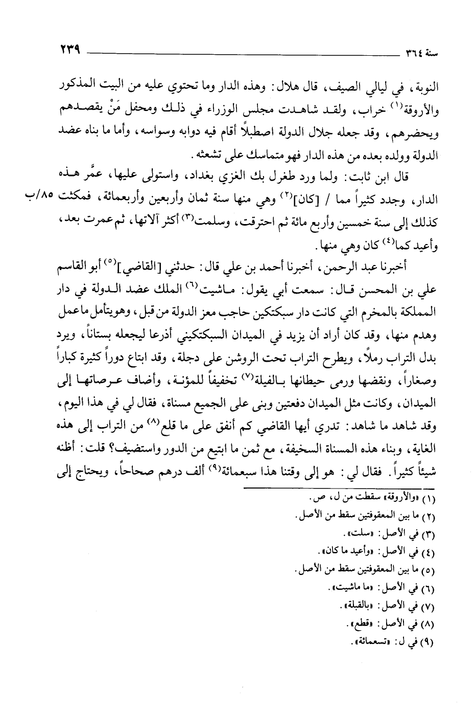 النوبة، في ليالي الصيف، قال هلال: وهذه الدار وما تحتوي عليه من البيت المذكور والأروقة [1] خراب، ولقد شاهدت مجلس الوزراء في ذلك ومحفل مَنْ يقصدهم ويحضرهم، وقد جعله جلال الدولة اصطبلا أقام فيه دوابه وسواسه، وأما ما بناه عضد الدولة وولده بعده من هذه الدار فهو متماسك على تشعثه.