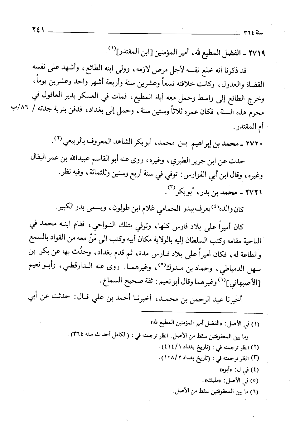 [1] في الأصل: «الفضل أمير المؤمنين المطيع للَّه» وما بين المعقوفتين سقط من الأصل. انظر ترجمته في: (الكامل أحداث سنة 364) .