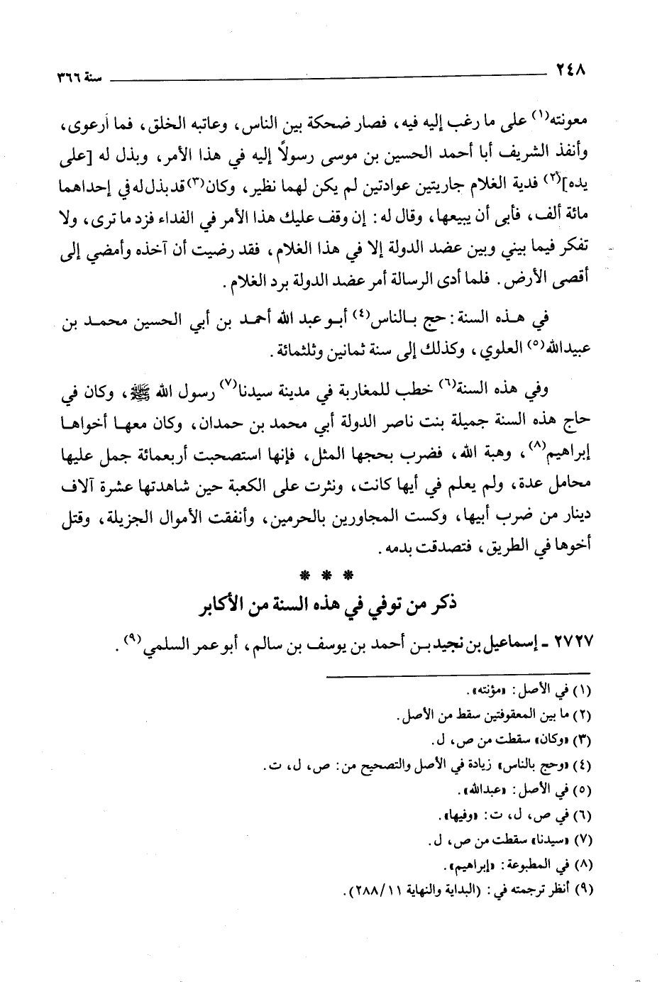 في هذه السنة: حج بالناس [4] أبو عبد الله أحمد بن أبي الحسين محمد بن عبيد الله [5] العلويّ، وكذلك إلى سنة ثمانين وثلاثمائة.