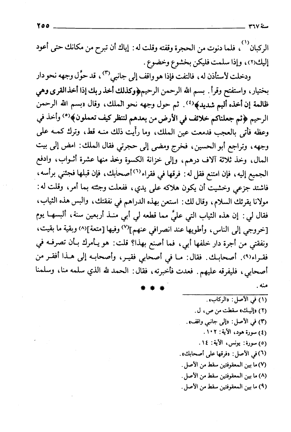 ودخلت لأستأذن له، فالتفت فإذا هو واقف إلى جانبي [3] ، قد حول وجهه نحو دار بختيار، واستفتح وقرأ. بِسْمِ اللَّهِ الرَّحْمَنِ الرَّحِيمِ (وَكَذلِكَ أَخْذُ رَبِّكَ إِذا أَخَذَ الْقُرى وَهِيَ ظالِمَةٌ إِنَّ أَخْذَهُ أَلِيمٌ شَدِيدٌ) 11: 102 [4] . ثم حول وجهه نحو الملك، وقال «بِسْمِ اللَّهِ الرَّحْمَنِ الرَّحِيمِ (ثُمَّ جَعَلْناكُمْ خَلائِفَ فِي الْأَرْضِ من بَعْدِهِمْ لِنَنْظُرَ كَيْفَ تَعْمَلُونَ) 10: 14 [5] وأخذ في وعظه فأتى بالعجب فدمعت عين الملك، وما رأيت ذلك منه قط، وترك كمه على وجهه، وتراجع أبو الحسين، فخرج ومضى إلى حجرتي فقال الملك: امض إلى بيت المال، وخذ ثلاثة آلاف درهم، وإلى خزانة الكسوة وخذ منها عشرة أثواب، وادفع الجميع إليه، فإن امتنع فقل له: فرقها في فقراء [6] أصحابك، فإن قبلها فجئني برأسه، فاشتد جزعي وخشيت أن يكون هلاكه على يدي، ففعلت وجئته بما أمر، وقلت له: