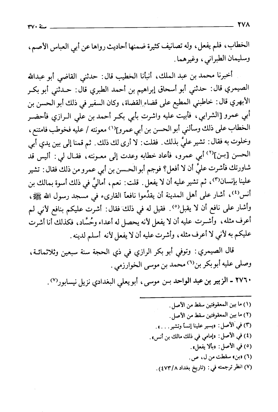 قال الصيمري: وتوفي أبو بكر الرازي في ذي الحجة سنة سبعين وثلاثمائة، وصلّى عليه أبو بكر بن [6] محمد بن موسى الخُوارَزْميّ.
