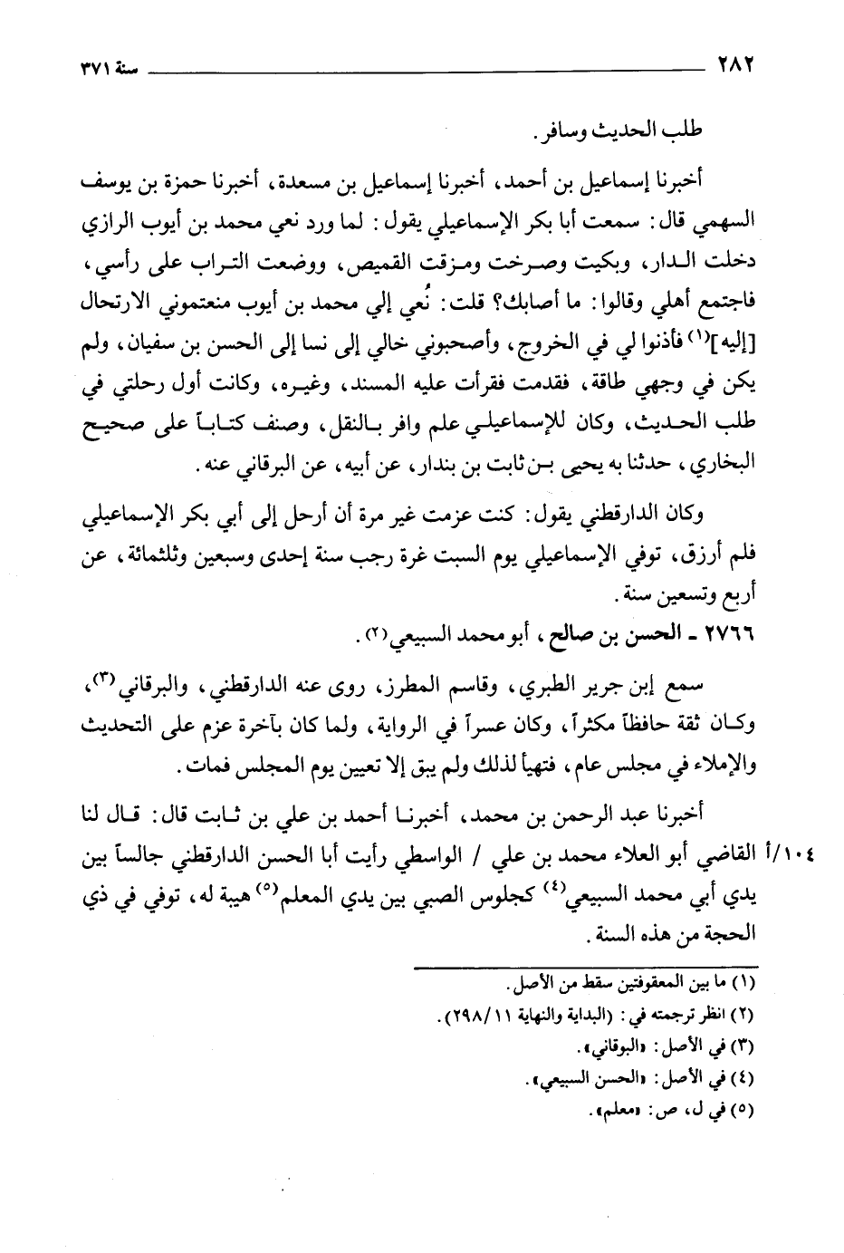 أخبرنا إسماعيل بن أحمد، أَخْبَرَنَا إِسْمَاعِيلُ بْنُ مَسْعَدَةَ، أَخْبَرَنَا حَمْزَةُ بْنُ يوسف السهمي قال: سمعت أبا بكر الإسماعيلي يقول: لما ورد نعي محمد بن أيوب الرازي دخلت الدار، وبكيت وصرخت ومزقت القميص، ووضعت التراب على رأسي، فاجتمع أهلي وقالوا: ما أصابك؟ قلت: نُعِيَ إليَّ محمد بن أيوب منعتموني الارتحال [إليه] [1] فأذنوا لي في الخروج، وأصحبوني خالي إلى نسا إلى الحسن بن سفيان، ولم يكن في وجهي طاقة، فقدمت فقرأت عليه المسند، وغيره، وكانت أول رحلتي في طلب الحديث، وكان للإسماعيلي علم وافر بالنقل، وصنف كتابا على صحيح البخاري، حدثنا به يحيى بن ثابت بن بندار، عن أبيه، عن البرقاني عنه.
