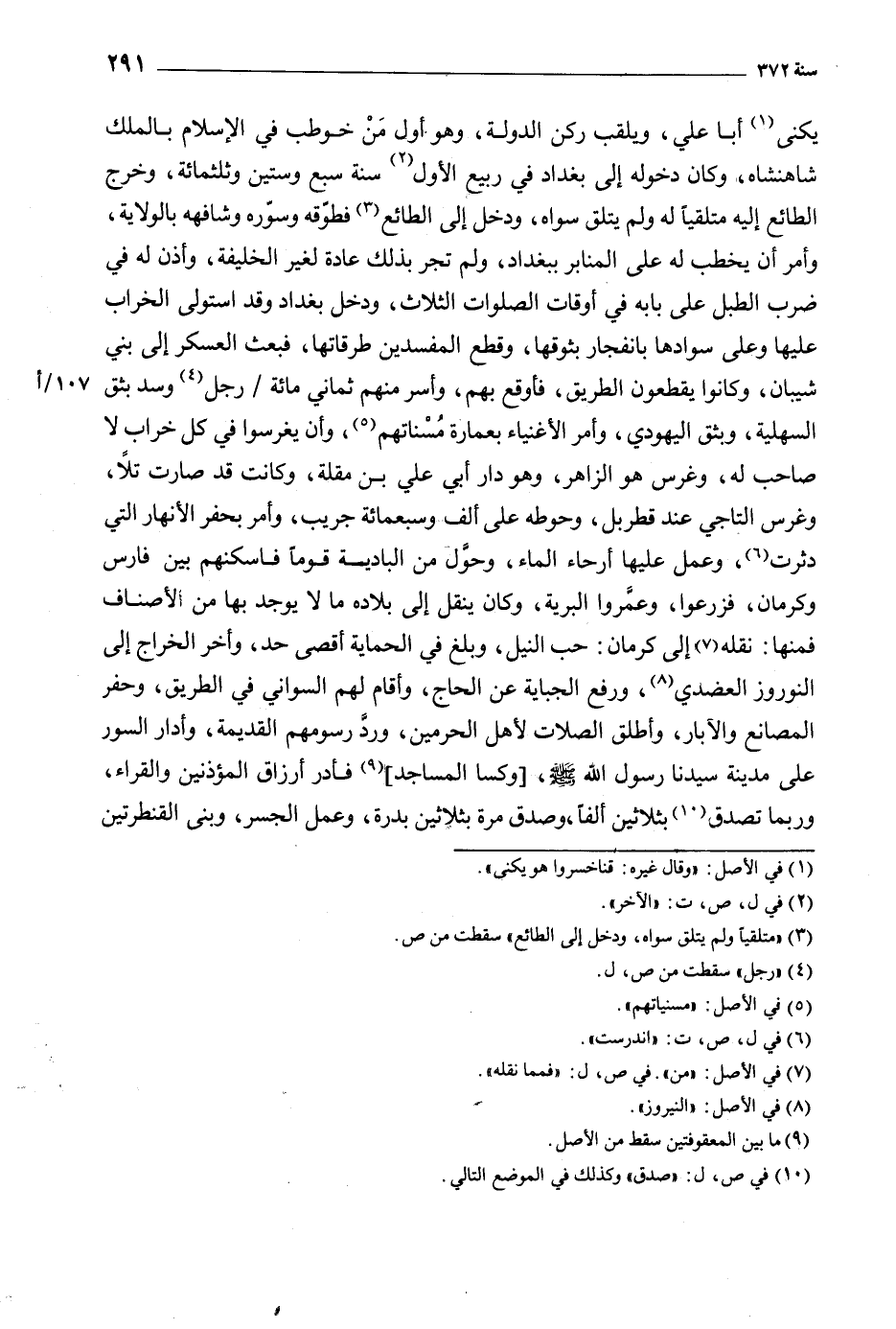 يكنى [1] أبا علي، ويلقب ركن الدولة، وهو أول من خوطب في الإسلام بالملك شاهنشاه، وكان دخوله إلى بغداد في ربيع الأول [2] سنة سبع وستين وثلاثمائة، وخرج الطائع إليه متلقيا له ولم يتلق سواه، ودخل إلى الطائع [3] فطوّقه وسوره وشافهه بالولاية، وأمر أن يخطب له على المنابر ببغداد، ولم تجر بذلك عادة لغير الخليفة، وأذن له في ضرب الطبل على بابه في أوقات الصلوات الثلاث، ودخل بغداد وقد استولى الخراب عليها وعلى سوادها بانفجار بثوقها، وقطع المفسدين طرقاتها، فبعث العسكر إلى بني شيبان، وكانوا يقطعون الطريق، فأوقع بهم، وأسر منهم ثماني مائة/ رجل [4] وسد بثق السهلية، وبثق اليهودي، وأمر الأغنياء بعمارة مسناتهم [5] ، وأن يغرسوا في كل خراب لا صاحب له، وغرس هو الزاهر، وهو دار أبي علي بن مقلة، وكانت قد صارت تلا، وغرس التاجي عند قطربُّل، وحوطه على ألف وسبعمائة جريب، وأمر بحفر الأنهار التي دثرت [6] ، وعمل عليها أرحاء الماء، وحول من البادية قوما فأسكنهم بين فارس وكرمان، فزرعوا، وعمروا البرية، وكان ينقل إلى بلاده ما لا يوجد بها من الأصناف فمنها: نقله [7] إلى كرمان: حب النيل، وبلغ في الحماية أقصى حد، وأخر الخراج إلى النوروز العضدي [8] ، ورفع الجباية عن الحاج، وأقام لهم السواني في الطريق، وحفر المصانع والآبار، وأطلق الصلات لأهل الحرمين، ورد رسومهم القديمة، وأدار السور على مدينة سيدنا رسول الله صلى الله عليه وَسَلَّمَ، [وكسا المساجد] [9] فأدر أرزاق المؤذنين والقراء، وربما تصدق [10] بثلاثين ألفا، وصدق مرة بثلاثين بدرة، وعمل الجسر، وبنى القنطرتين