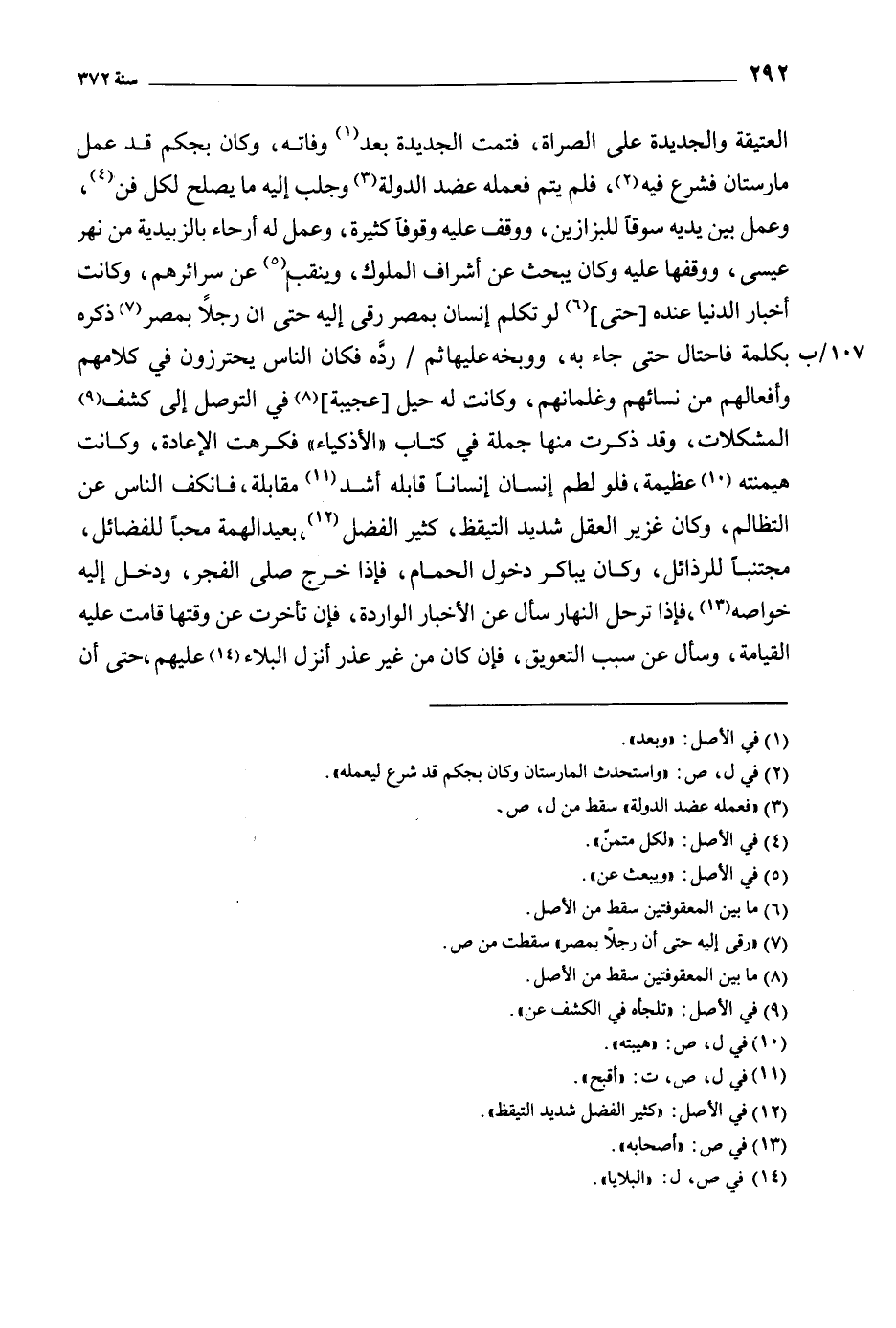 العتيقة والجديدة على الصراة، فتمت الجديدة بعد [1] وفاته، وكان بجكم قد عمل مارستان فشرع فِيهِ [2] ، فلم يتم فعمله عضد الدولة [3] وجلب إليه ما يصلح لكل فن [4] ، وعمل بين يديه سوقا للبزازين، ووقف عليه وقوفا كثيرة، وعمل له أرحاء بالزبيدية من نهر عيسى، ووقفها عليه وكان يبحث عن أشراف الملوك، وينقب [5] عن سرائرهم، وكانت أخبار الدنيا عنده [حتى] [6] لو تكلم إنسان بمصر رقي إليه حتى أن رجلا بمصر [7] ذكره بكلمة فاحتال حتى جاء به، ووبخه عليها ثم/ رده فكان الناس يحترزون في كلامهم وأفعالهم من نسائهم وغلمانهم، وكانت له حيل [عجيبة] [8] في التوصل إلى كشف [9] المشكلات، وقد ذكرت منها جملة في كتاب «الأذكياء» فكرهت الإعادة، وكانت هيمنته [10] عظيمة، فلو لطم إنسان إنسانا قابله أشد [11] مقابلة، فانكف الناس عن التظالم، وكان غزير العقل شديد التيقظ، كثير الفضل [12] ، بعيد الهمة محبا للفضائل، مجتنبا للرذائل، وكان يباكر دخول الحمام، فإذا خرج صلى الفجر، ودخل إليه خواصه [13] ، فإذا ترحل النهار سأل عن الأخبار الواردة، فإن تأخرت عن وقتها قامت عليه القيامة، وسأل عن سبب التعويق، فان كان من غير عذر أنزل البلاء [14] عليهم، حتى أن
