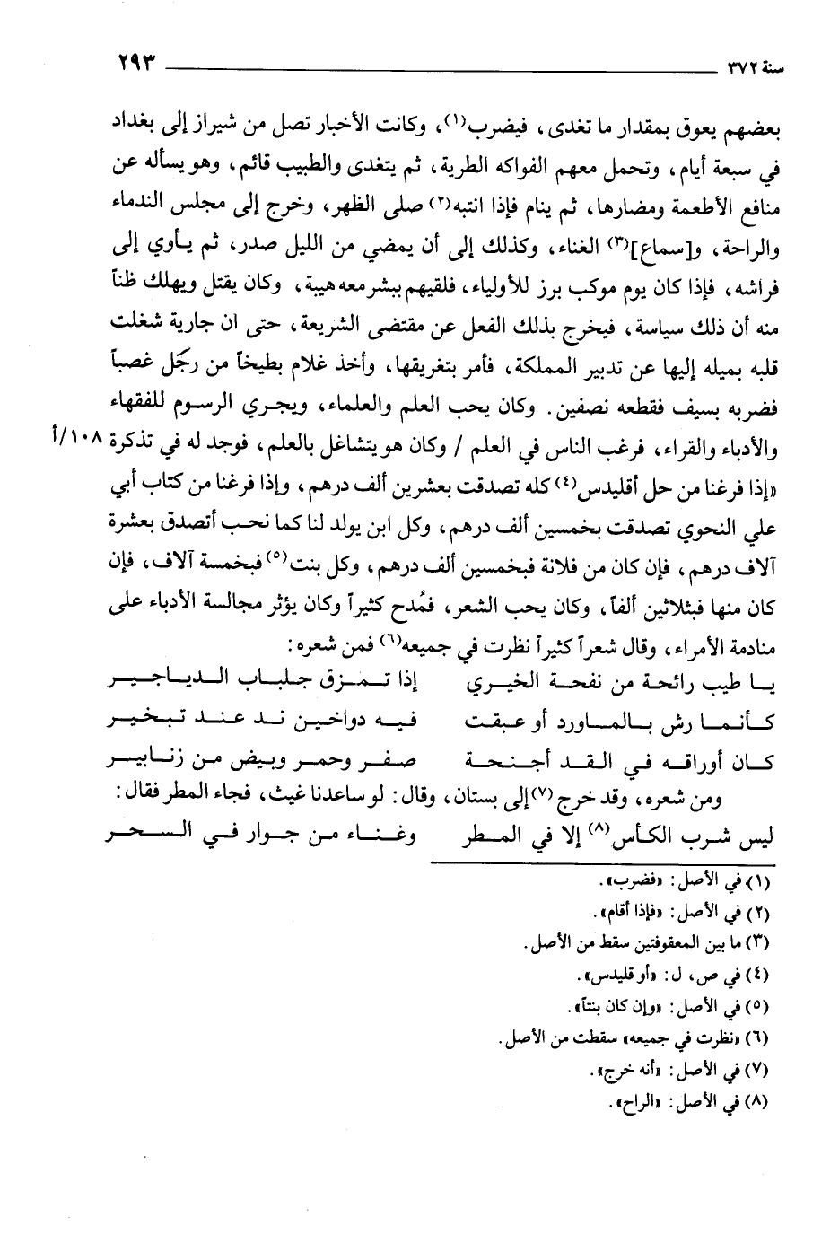 بعضهم يعوق بمقدار ما تغدى، فيضرب [1] ، وكانت الأخبار تصل من شيراز إلى بغداد في سبعة أيام، وتحمل معهم الفواكه الطرية، ثم يتغدى والطبيب قائم، وهو يسأله عن منافع الأطعمة ومضارها، ثم ينام فإذا انتبه [2] صلى الظهر، وخرج إلى مجلس الندماء والراحة، و [سماع] [3] الغناء، وكذلك إلى أن يمضي من الليل صدر، ثم يأوي إلى فراشه، فإذا كان يوم موكب برز للأولياء، فلقيهم ببشر معه هيبة، وكان يقتل ويهلك ظنا منه أن ذلك سياسة، فيخرج بذلك الفعل عن مقتضى الشريعة، حتى أن جارية شغلت قلبه بميله إليها عن تدبير المملكة، فأمر بتغريقها، وأخذ غلام بطيخا من رجل غصبا فضربه بسيف فقطعه نصفين. وكان يحب العلم والعلماء، ويجري الرسوم للفقهاء والأدباء والقراء، فرغب الناس في العلم/ وكان هو يتشاغل بالعلم، فوجد له في تذكرة «إذا فرغنا من حل إقليدس [4] كله تصدقت بعشرين ألف درهم، وإذا فرغنا من كتاب أبي علي النحوي تصدقت بخمسين ألف درهم، وكل ابن يولد لنا كما نحب أتصدق بعشرة آلاف درهم، فإن كان من فلانة فبخمسين ألف درهم، وكل بنت [5] فبخمسة آلاف، فإن كان منها فبثلاثين ألفا، وكان يحب الشعر، فمدح كثيرا وكان يؤثر مجالسة الأدباء على منادمة الأمراء، وقال شعرا كثيرا نظرت فِي جميعه [6] فمن شعره:
