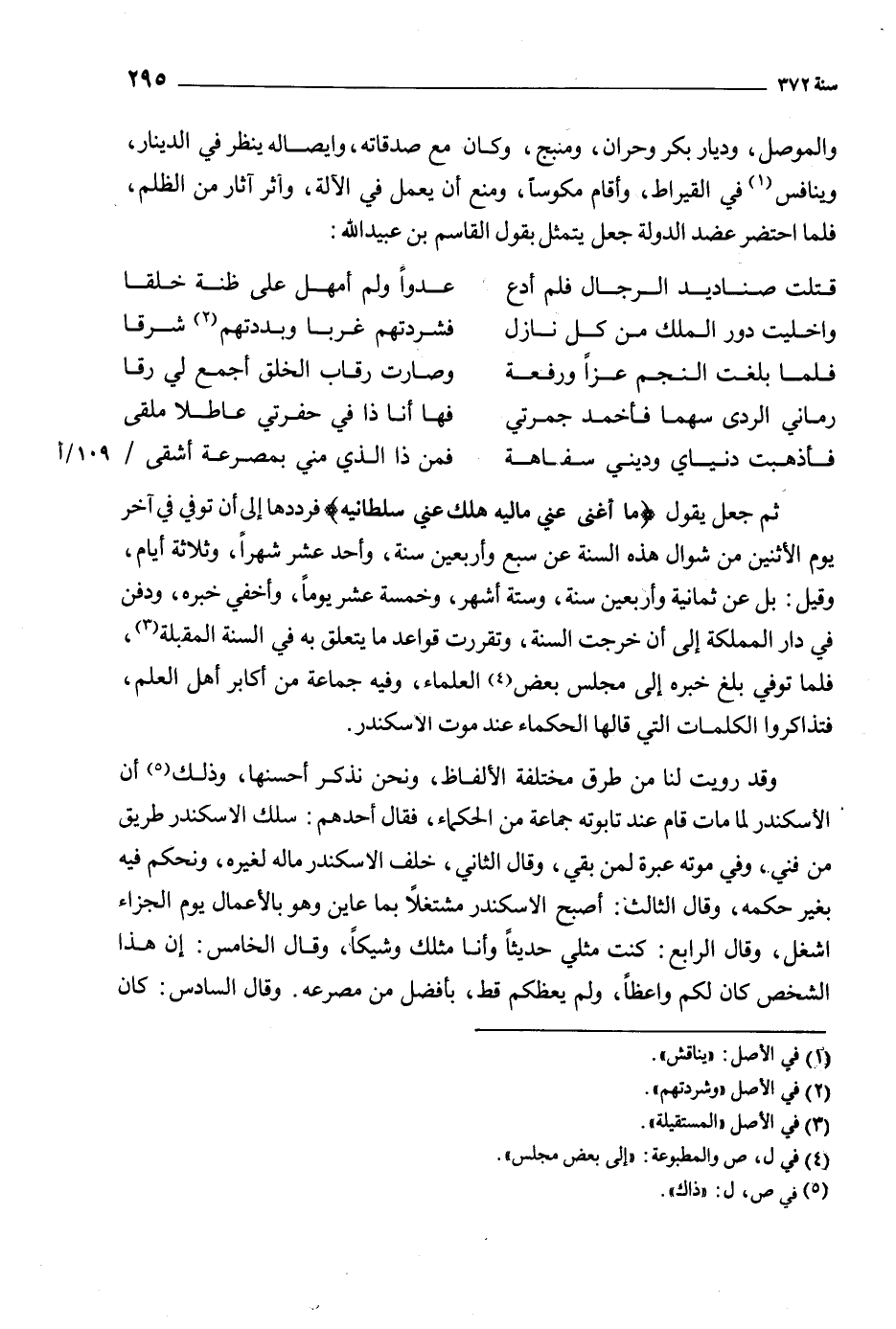 وقد رويت لنا من طرق مختلفة الألفاظ، ونحن نذكر أحسنها، وذلك [5] أن الإسكندر لما مات قام عند تابوته جماعة من الحكماء، فقال أحدهم: سلك الإسكندر طريق من فني، وفي موته عبرة لمن بقي، وقال الثاني، خلف الإسكندر ماله لغيره، ونحكم فيه بغير حكمه، وقال الثالث: أصبح الإسكندر مشتغلا بما عاين وهو بالأعمال يوم الجزاء أَشْغَلُ، وقال الرابع: كنت مثلي حديثا وأنا مثلك وشيكا، وقال الخامس: إن هذا الشخص كان لكم واعظا، ولم يعظكم قط، بأفضل من مصرعه. وقال السادس: كان