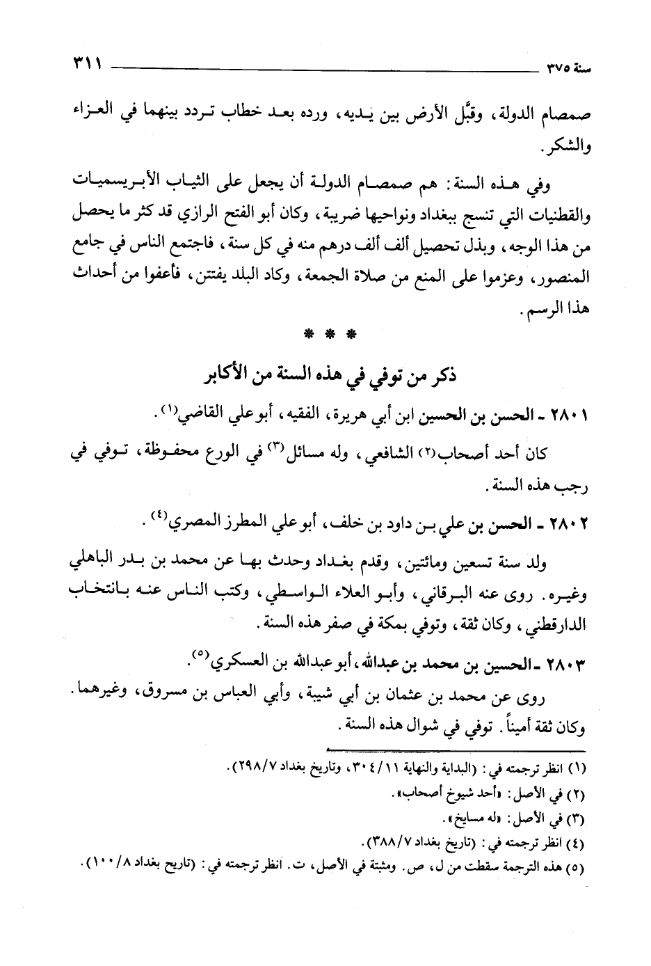 وفي هذه السنة: هم صمصام الدولة أن يجعل على الثياب الإبريسميات والقطنيات التي تنسج ببغداد ونواحيها ضريبة، وكان أبو الفتح الرازي قد كثر ما يحصل من هذا الوجه، وبذل تحصيل ألف ألف درهم منه في كل سنة، فاجتمع الناس في جامع المنصور، وعزموا على المنع من صلاة الجمعة، وكاد البلد يفتتن، فاعفوا من أحداث هذا الرسم.