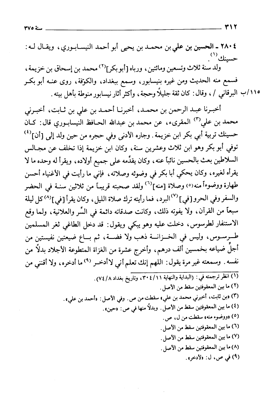 أَخْبَرَنَا عَبْدُ الرَّحْمَنِ بْنُ مُحَمَّدٍ، أَخْبَرَنَا أَحْمَدُ بن علي بن ثابت، أخبرني محمد بن علي [3] المقرئ، عن محمد بن عبد الله الحافظ النيسابوري قال: كان حسينك تربية أبي بكر ابن خزيمة. وجاره الأدنى وفي حجره من حين ولد إلى [أن] [4] توفي أبو بكر وهو ابن ثلاث وعشرين سنة، وكان ابن خزيمة إذا تخلف عن مجالس السلاطين بعث بالحسين نائبا عنه، وكان يقدمه على جميع أولاده، ويقرأ له وحده ما لا يقرأه لغيره، وكان يحكي أبا بكر في وضوئه وصلاته، فأني ما رأيت في الأغنياء أحسن طهارة ووضوءا منه [5] وصلاة [منه] [6] ولقد صحبته قريبا من ثلاثين سنة في الحضر والسفر وفي الحرو [في] [7] البرد، فما رأيته ترك صلاة الليل، وكان يقرأ [في] [8] كل ليلة سبعا من القرآن، ولا يفوته ذلك، وكانت صدقاته دائمة في السر والعلانية، ولما وقع الاستنفار لطرسوس، دخلت عليه وهو يبكي ويقول: قد دخل الطاغي ثغر المسلمين طرسوس، وليس في الخزانة ذهب ولا فضة، ثم باع ضيعتين نفيستين من أجل ضياعه بخمسين ألف درهم، واخرج عشرة من الغزاة المتطوعة الأجلاد بدلا من نفسه. وسمعته غير مرة يقول: اللَّهمّ إنك تعلم أني لا أدخر [9] ما أدخره، ولا أقني من
