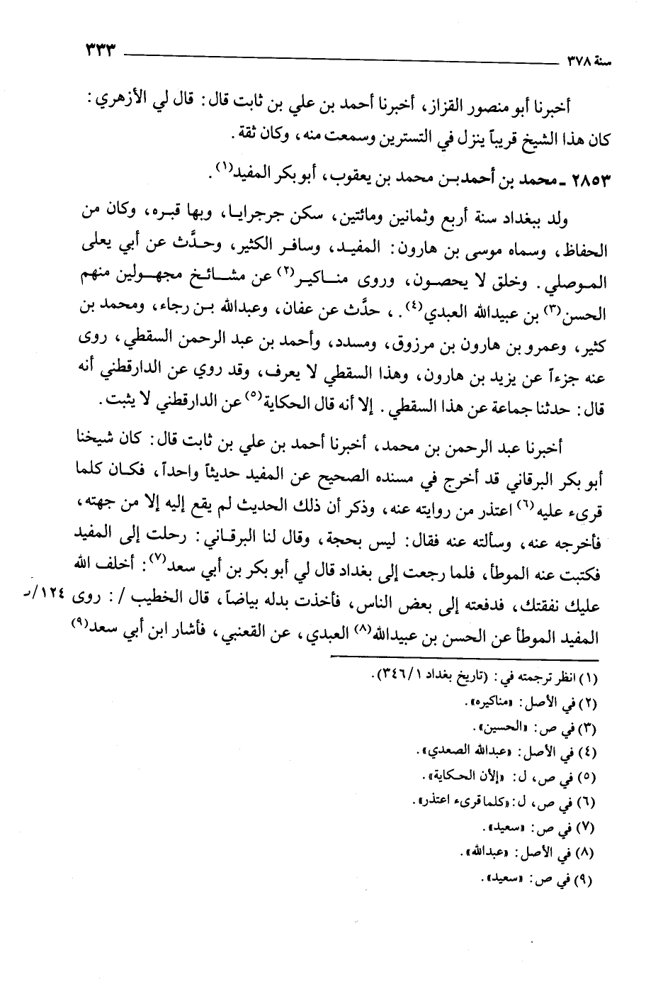أَخْبَرَنَا عَبْدُ الرَّحْمَنِ بْنُ مُحَمَّدٍ، أَخْبَرَنَا أَحْمَدُ بن علي بن ثابت قال: كان شيخنا أبو بكر البرقاني قد أخرج في مسنده الصحيح عن المفيد حديثا واحدا، فكان كلما قرئ عَلَيْهِ [6] اعتذر من روايته عنه، وذكر أن ذلك الحديث لم يقع إليه إلا من جهته، فأخرجه عنه، وسألته عنه فقال: ليس بحجة، وقال لنا البرقاني: رحلت إلى المفيد فكتبت عنه الموطأ، فلما رجعت إلى بغداد قال لي أبو بكر بن أبي سعد [7] : أخلف الله عليك نفقتك، فدفعته إلى بعض الناس، فأخذت بدله بياضا، قال الخطيب/: روى المفيد الموطأ عن الحسن بن عبيد الله [8] العبدي، عن القعنبي، فأشار ابن أبي سعد [9]