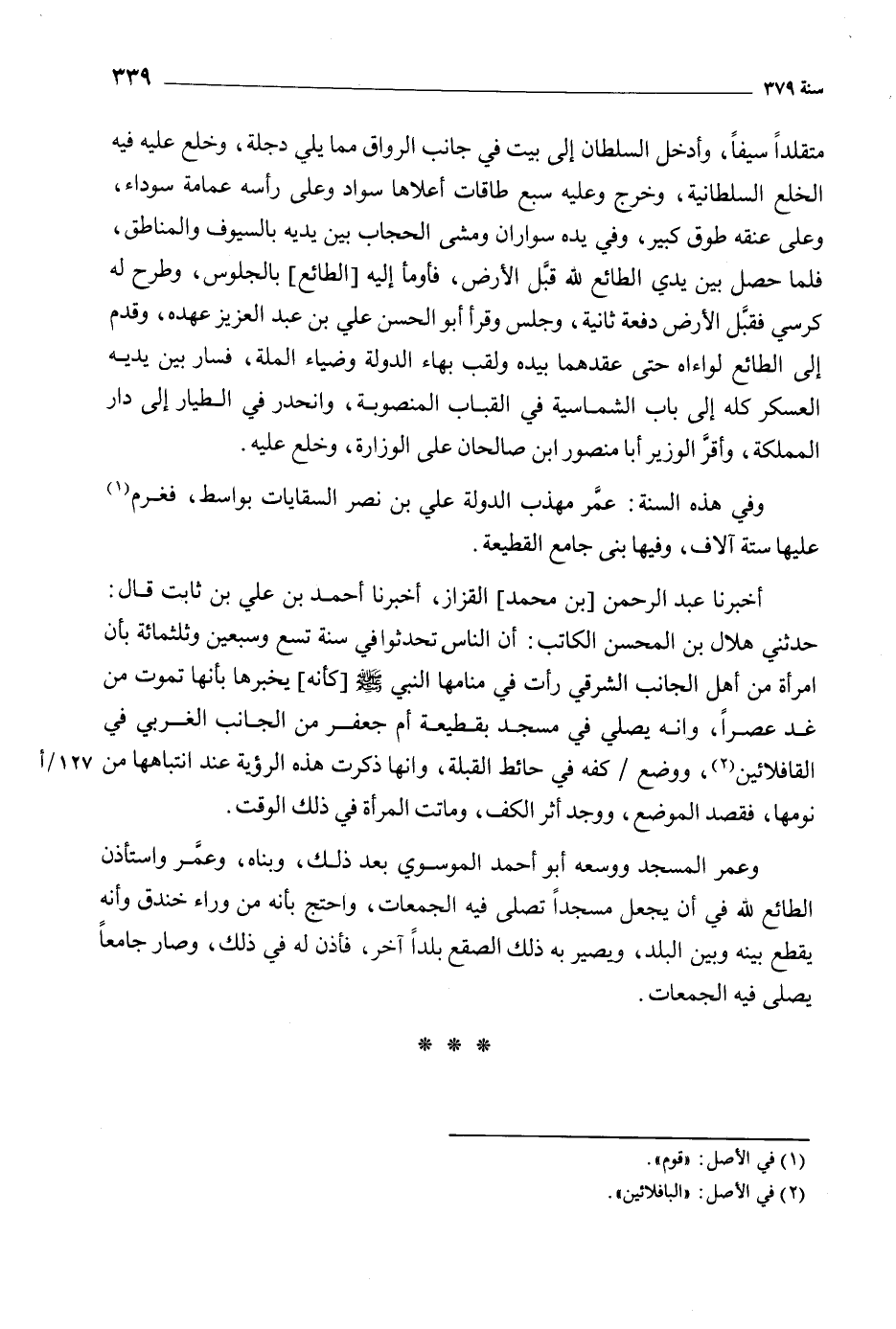 حَدَّثَنِي هلال بن المحسن الكاتب: أن الناس تحدثوا في سنة تسع وسبعين وثلاثمائة بأن امرأة من أهل الجانب الشرقي رأت في منامها النبي صلى الله عليه وسلم [كأنه] يخبرها بأنها تموت من غد عصرًا، وأنه يصلى في مسجد بقطيعة أم جعفر من الجانب الغربي في القافلاءين [2] ، ووضع/ كفه في حائط القبلة، وأنها ذكرت هذه الرؤية عند انتباهها من نومها، فقصد الموضع، ووجد أثر الكف، وماتت المرأة في ذلك الوقت.