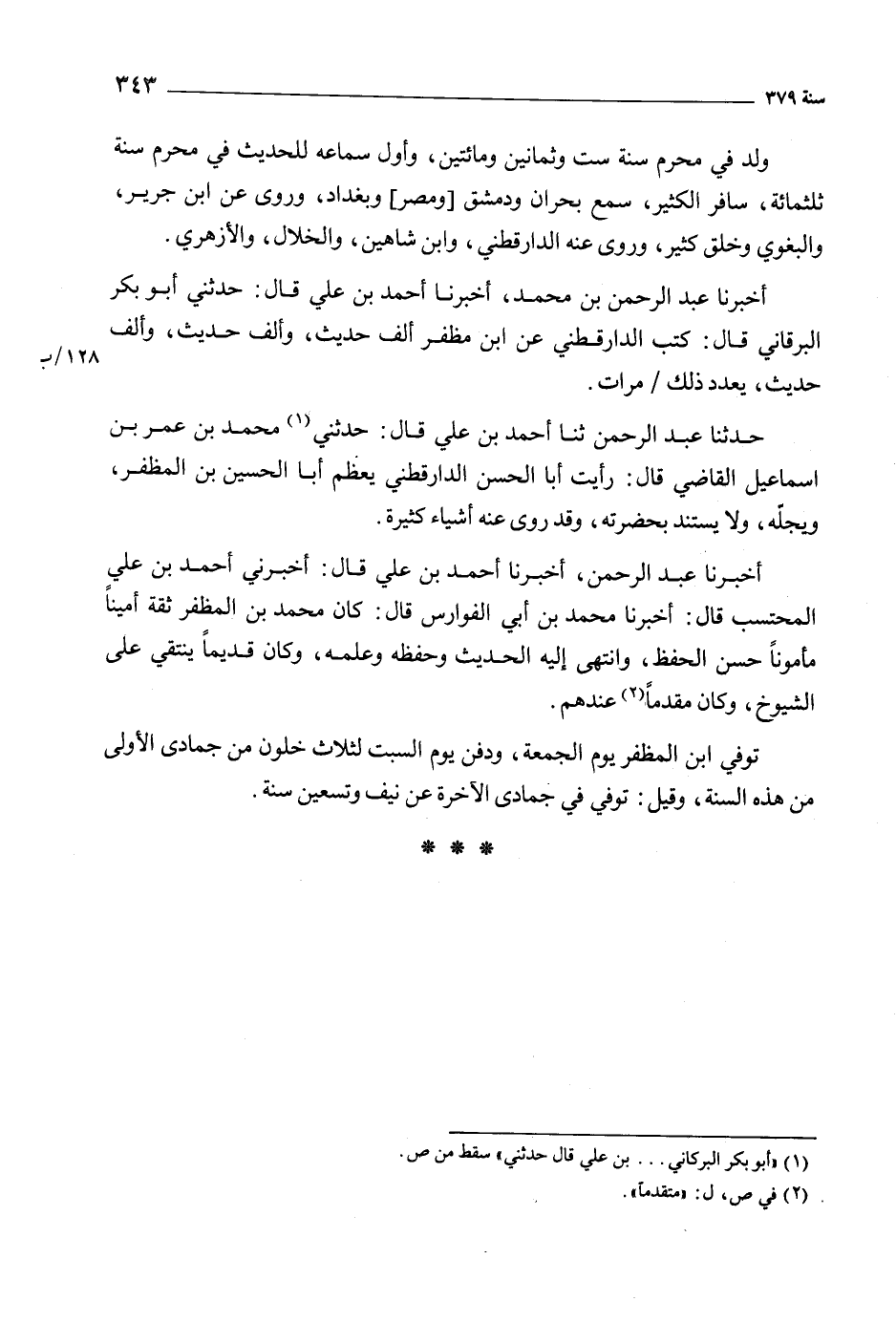 أَخْبَرَنَا عَبْدُ الرَّحْمَنِ بْنُ مُحَمَّدٍ، أَخْبَرَنَا أَحْمَدُ بن علي قال: حدثني أبو بكر البرقاني قال: كتب الدارقطني عن ابن مظفر ألف حديث، وألف حديث، وألف حديث، يعدد ذلك مرات.