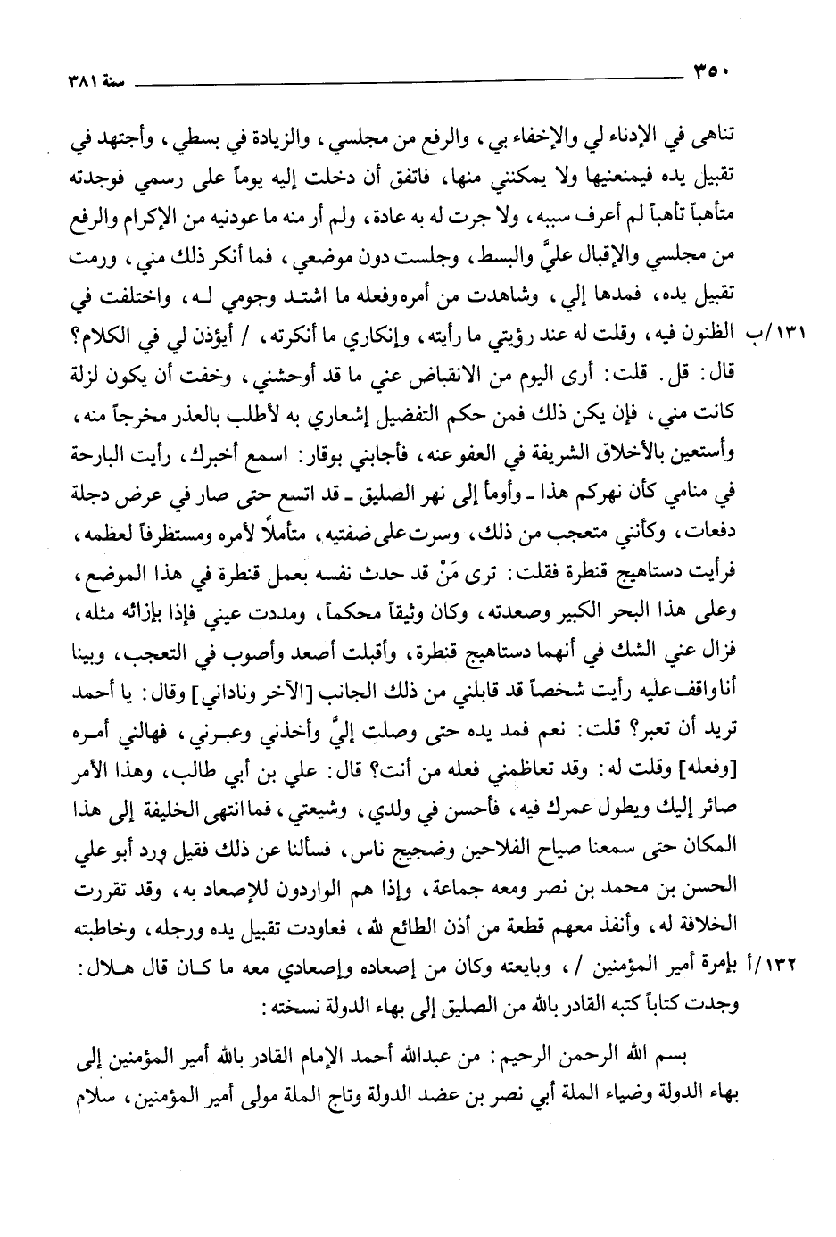 بسم الله الرحمن الرحيم: من عبد الله أحمد الإمام القادر باللَّه أمير المؤمنين إلى بهاء الدولة وضياء الملة أبي نصر بن عضد الدولة وتاج الملة مولي أمير المؤمنين، سلام
