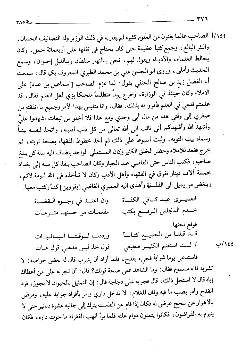 الصاحب عالما بفنون من العلوم كثيرة لم يقاربه في ذلك الوزير وله التصانيف الحسان، والنثر البالغ، وجمع كتبا عظيمة حتى كان يحتاج في نقلها على أربعمائة حمل، وكان يخالط العلماء، والأدباء ويقول لهم، نحن بالنهار سلطان وبالليل إخوان، وسمع الحديث وأملى، وروى أبو الحسن علي بن محمد الطبري المعروف بكيا قال: سمعت أبا الفضل زيد بن صالح الحنفي يقول: لما عزم الصاحب [إسماعيل بن عباد] على الإملاء وكان حينئذ في الوزارة، وخرج يوما متطلسا متحنكا بزي أهل العلم فقال، قد علمتم قدمي في العلم فأقروا له بذلك، فقال، وأنا متلبس بهذا الأمر وجميع ما انفقته من صغري إلى وقتي هذا من مال أبي وجدي ومع هذا فلا أخلو من تبعات اشهدوا عَلِيّ وأشهد الله وأشهدكم أني تائب الى الله تعالى من كل ذنب أذنبته، واتخذ لنفسه بيتا وسماه بيت التوبة، ولبث أسبوعا على ذلك ثم أخذ خطوط الفقهاء بصحة توبته، ثم خرج فقعد للإملاء وحضر الخلق الكثير وكان المستملي الواحد ينضاف إليه ستة كل يبلغ صاحبه، فكتب الناس حتى القاضي عبد الجبار وكان الصاحب ينفذ كل سنة إلى بغداد خمسة آلاف دينار تفرق في الفقهاء وأهل الأدب وكان لا تأخذه في الله لومة لائم، ويبغض من يميل إلى الفلسفة وأهدى إليه العميري القاضي [بقزوين] كتبا وكتب معها.