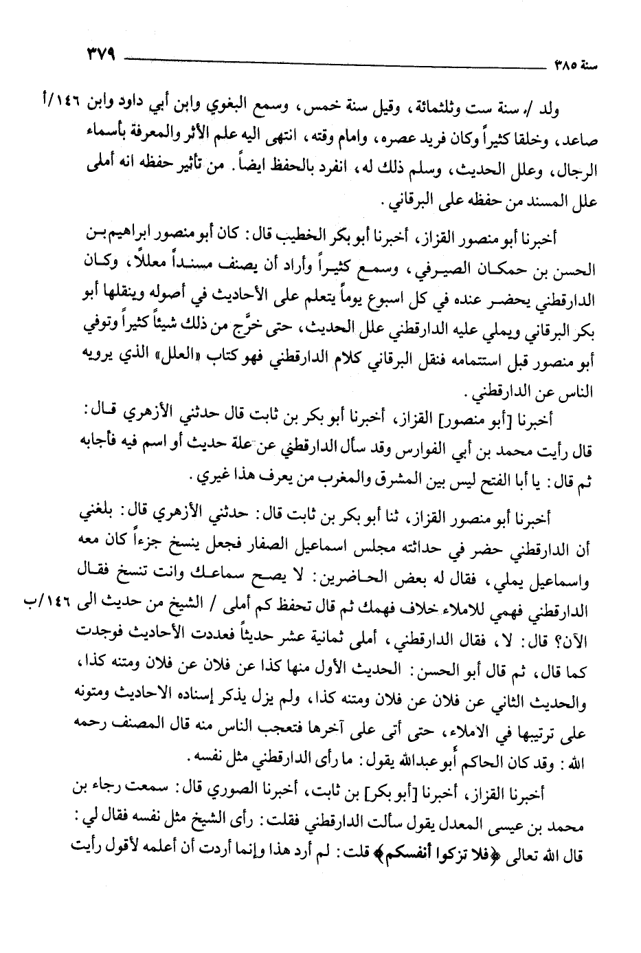 أخبرنا أبو منصور القزاز، ثنا أبو بكر بن ثابت قَالَ: حَدَّثَنِي الأزهري قال: بلغني أن الدارقطني حضر في حداثته مجلس إسماعيل الصفار فجعل ينسخ جزءا كان معه وإسماعيل يملي، فقال له بعض الحاضرين: لا يصح سماعك وأنت تنسخ فقال الدارقطني فهمي للإملاء خلاف فهمك ثم قال تحفظ كم أملى الشيخ من حديث إلى الآن؟ قال: لا، فقال الدارقطني، أملى ثمانية عشر حديثا فعددت الأحاديث فوجدت كما قال، ثم قال أبو الحسن: الحديث الأول منها كذا عن فلان عن فلان ومتنه كذا، والحديث الثاني عن فلان عن فلان ومتنه كذا، ولم يزل يذكر إسناده الأحاديث ومتونه على ترتيبها في الإملاء، حتى أتى على آخرها فتعجب الناس منه قال المصنف رحمه الله: وقد كان الحاكم أبو عبد الله يقول: ما رأي الدارقطني مثل نفسه.