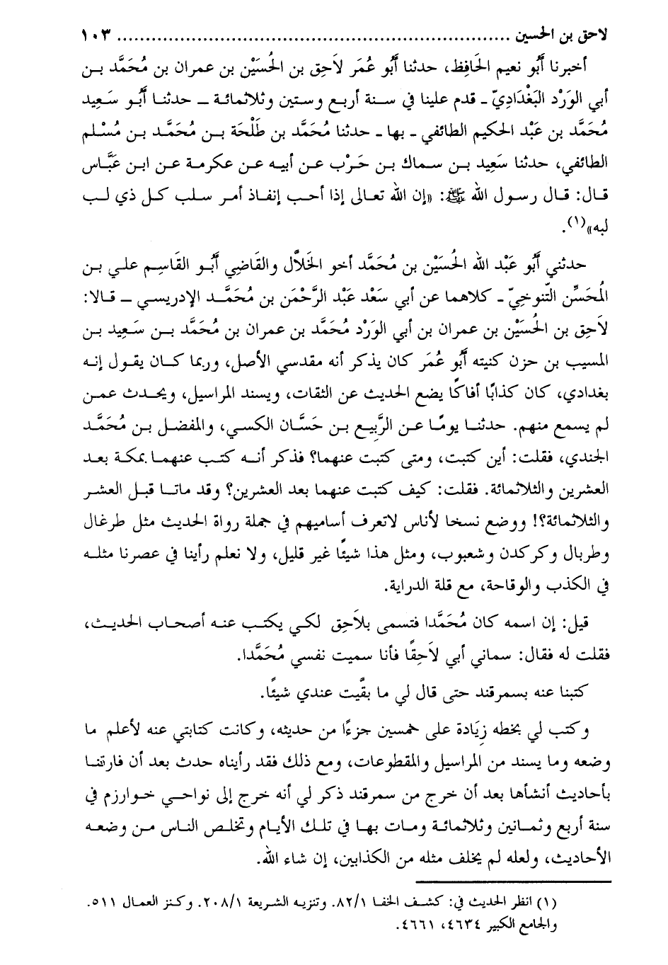 أخبرنا أبو نعيم الحافظ، حَدَّثَنَا أَبُو عُمَرَ لاحِقُ بْنُ الْحُسَيْنِ بْنِ عِمْرَانَ بْنِ مُحَمَّدِ بْنِ أَبِي الْوَرْدِ الْبَغْدَادِيُّ- قدم علينا في سنة أربع وستين وثلاثمائة- حَدَّثَنَا أَبُو سَعِيدٍ مُحَمَّدُ بْنُ عَبْدِ الْحَكِيمِ الطائفي- بها- حَدَّثَنَا مُحَمَّدُ بْنُ طَلْحَةَ بْنِ مُحَمَّدِ بْنِ مسلم الطائفي، حَدَّثَنَا سَعِيدُ بْنُ سِمَاكِ بْنِ حَرْبٍ عَنْ أَبِيهِ عَنْ عِكْرِمَةَ عَنِ ابْنِ عَبَّاسٍ قَالَ: قَالَ رَسُولُ اللَّهِ صَلَّى اللَّهُ عَلَيْهِ وسلم: «إِنَّ اللَّهَ تَعَالَى إِذَا أَحَبَّ إِنْفَاذَ أَمْرٍ سَلَبَ كُلَّ ذِي لُبٍّ لُبَّهُ» [1] .