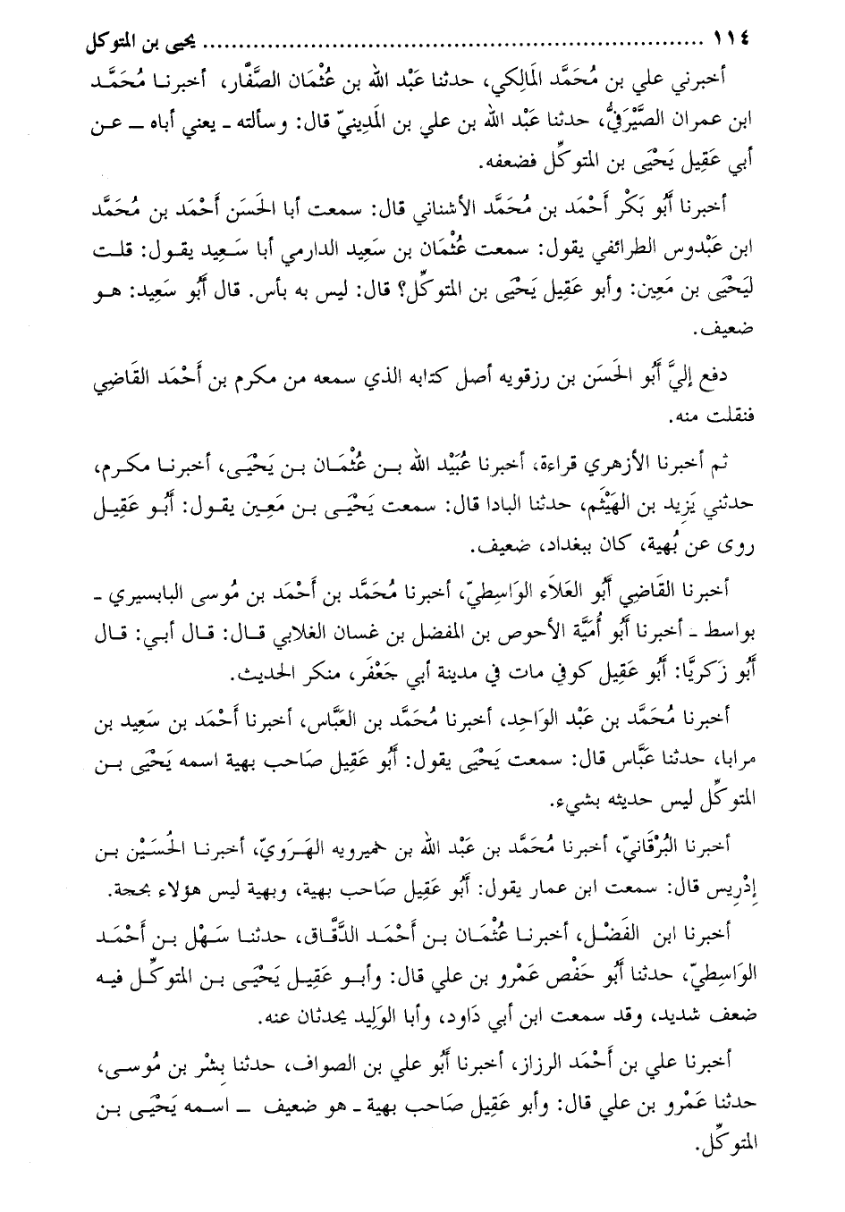 أخبرني علي بن محمّد المالكي، حدثنا عبد الله بن عثمان الصّفّار، أخبرنا محمّد ابن عمران الصّيرفيّ، حَدَّثَنَا عَبْدُ اللَّهِ بْنُ عَلِيِّ بْنِ الْمَدِينِيِّ قال: وسألته- يعني أباهُ- عَن أبي عقيل يَحْيَى بْن المتوكل فضعفه.
