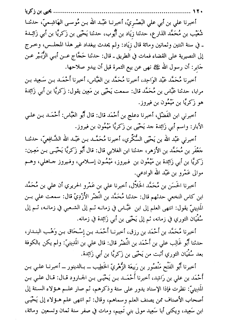 أخبرنا علي بن أبي علي البصريّ، أخبرنا عبد الله بن موسى الهاشميّ، حدثنا شعيب بن محمّد الذارع، حدثنا زياد بن أيّوب، حَدَّثَنَا يَحْيَى بْنُ زَكَرِيَّا بْنِ أَبِي زَائِدَةَ- فِي سَنَةِ اثْنَتَيْنِ وَثَمَانِينَ وَمِائَةٍ قَالَ زِيَادٌ: وَلَمْ يُحَدِّثْ بِبَغْدَادَ غَيْرَ هَذَا الْمَجْلِسِ، وَخَرَجَ إِلَى النَّصِيرِيَّةِ عَلَى الْقَضَاءِ فَمَاتَ فِي الطَّرِيقِ- قَالَ: حَدَّثَنَا حَجَّاجٌ عَنْ أَبِي الزُّبَيْرِ عَنْ جَابِرٍ: أَنَّ رَسُولَ اللَّهِ صَلَّى اللَّهُ عَلَيْهِ وَسَلَّمَ نَهَى عَنْ بَيْعِ الثَّمَرَةِ قَبْلَ أَنْ يَبْدُوَ صلاحها.
