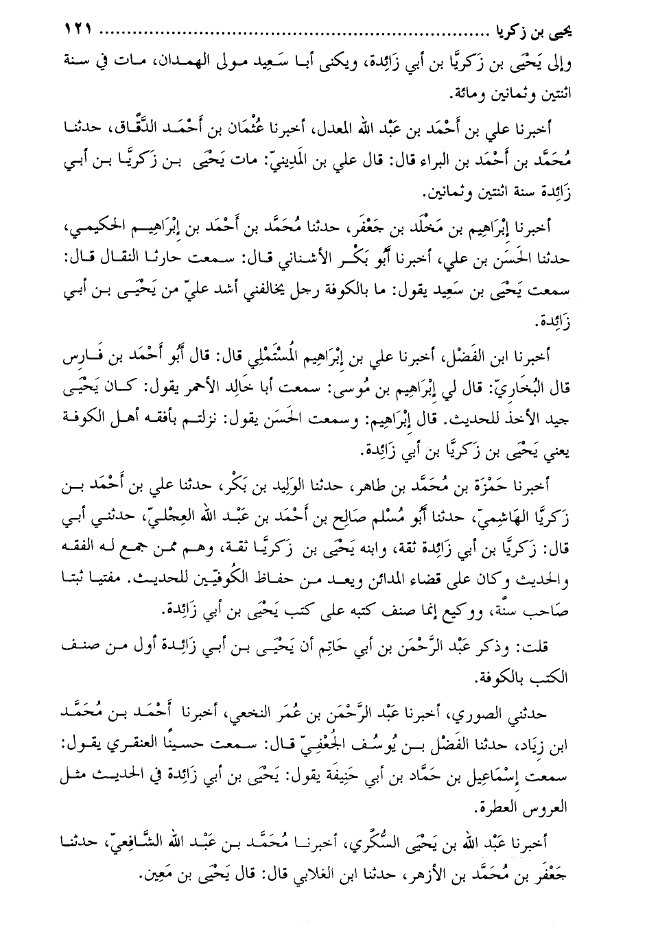أَخْبَرَنَا حمزة بن محمّد بن طاهر، حدثنا الوليد بن بكر، حدثنا علي بن أحمد بن زكريا الهاشمي، حدثنا أبو مسلم صالح بن أحمد بن عبد الله العجليّ، حدَّثَنِي أبي قَالَ: زكريا بْن أبي زائدة ثقة، وابنه يحيى بن زكريّا ثقة، وهم ممن جمع لَهُ الفقه والحديث وكان عَلَى قضاء المدائن ويُعد من حفاظ الكوفيين للحديث. مفتيًا ثبتًا صاحب سنة، ووكيع إنما صنف كتبه على كتب يحيى بن أبي زائدة.