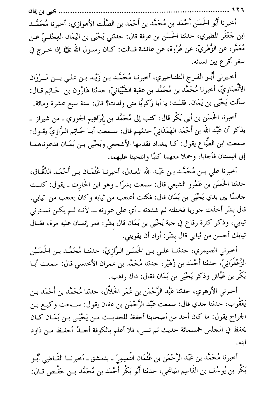 أَخْبَرَنَا عَلِيّ بْن مُحَمَّد بْن عَبْد الله المعدل، أخبرنا عثمان بن أحمد الدّقّاق، حَدَّثَنَا الْحَسَن بْن عَمْرو الشيعي قَالَ: سمعتُ بشرًا- وهو ابن الحارث- يَقُولُ: كنت جالِسًا بين يدي يَحْيَى بْن يَمان قَالَ: فكنتُ أعجب من ثيابه وكان يعجب من ثيابي.