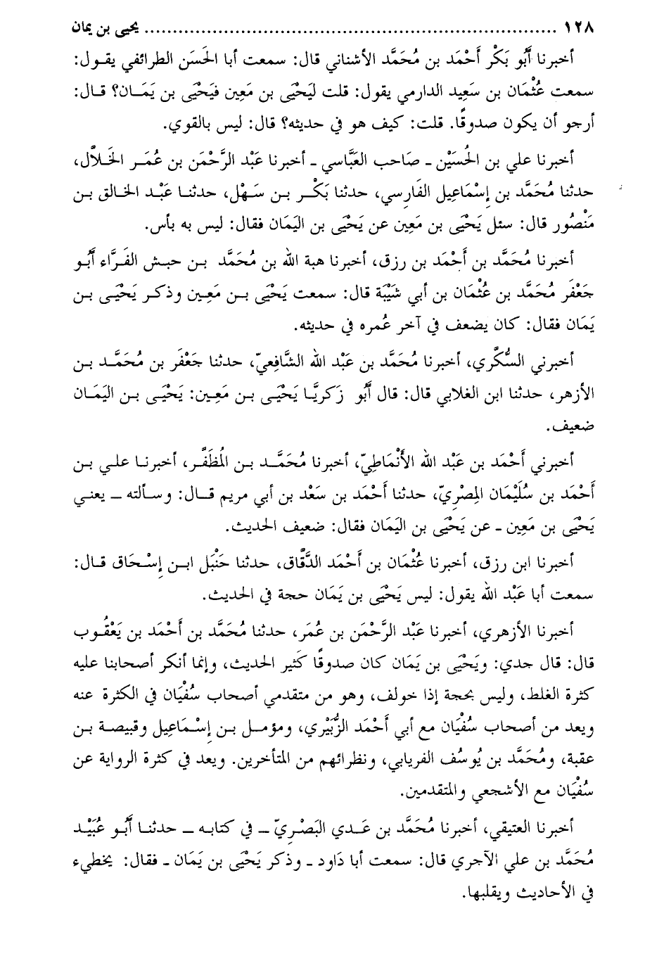 أخبرنا الأزهري، أخبرنا عبد الرّحمن بن عمر، حدثنا محمد بن أحمد بن يعقوب قال: قَالَ جدي: ويحيى بْن يَمان كَانَ صدوقًا كثيرَ الحديث، وإنّما أنكرَ أصحابُنا عَلَيْهِ كثرة الغلَط، وليس بحجة إذا خُولِفَ، وهو من متقدمي أصحاب سُفْيَان فِي الكثرة عَنْهُ ويُعد من أصحاب سُفْيَان مَعَ أبي أَحْمَد الزبيري، ومؤمَّل بْن إِسْمَاعِيل وقبيصة بْن عُقبة، وَمُحَمَّد بْن يوسف الفريابي، ونُظرائِهم من المتأخرين. ويُعد فِي كثرة الرواية عَن سُفْيَان مَعَ الأشجعي والمتقدمين.