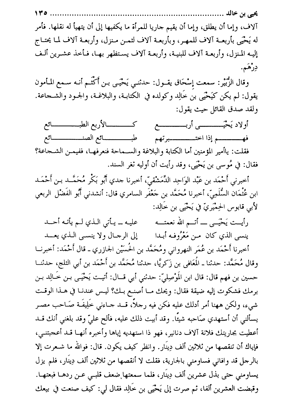 آلاف، وإمّا أن يُطلق، وإمّا أن يُقيم جاريًا للمرأة ما يكفيها إلى أن يتهيأ لَه نقلها. فأمر لَهُ يَحْيَى بأربعة آلاف للمهر، وبأربعة آلاف لِثمن منزل، وأربعة آلاف لِما يحتاج إِلَيْهِ المنزل، وأربعة آلاف للبنية، وأربعة آلاف يستظهرُ بِهَا، فأخذ عشرين ألف درهم.
