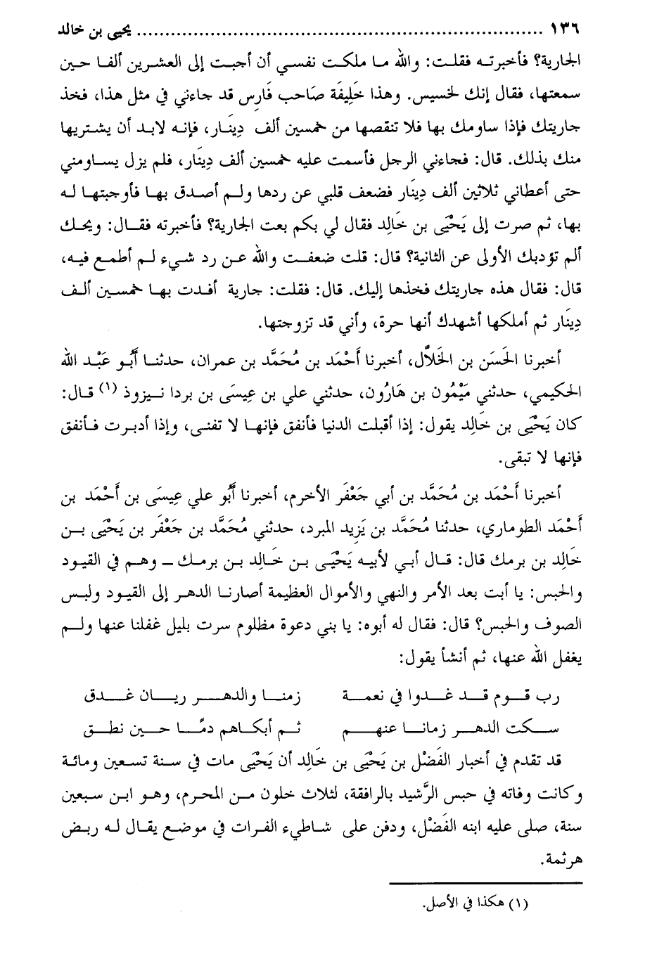 الجارية؟ فأخبرته فقلت: والله ما ملكت نفسي أن أجبت إلى العشرين ألفًا حين سمعتها، فقال إنك لخسيس. وهذا خليفة صاحب فارس قد جاءني فِي مثل هذا، فخذ جاريتك فإذا ساومك بِهَا فلا تنقصها من خمسين ألف دينار، فإنه لا بد أن يشتريها منك بذلك. قَالَ: فجاءني الرجل فأسمت عَلَيْهِ خمسين ألف دينار، فلم يزل يساومني حتى أعطاني ثلاثين ألف دينار فضعف قلبي عَن ردها ولَم أصدق بِهَا فأوجبتها لَهُ بِهَا، ثُمَّ صرتُ إلى يَحْيَى بْن خَالِد فقال لي بكم بعت الجارية؟ فأخبرته فقال: ويحك ألَم تؤدبك الأولى عَن الثانية؟ قَالَ: قلت ضعفتُ والله عَن رد شيء لم أطمع فِيهِ، قَالَ: فقال هذه جاريتك فخُذها إليك. قَالَ: فقلتُ: جارية أفدت بِهَا خمسين ألف دينار ثُمَّ أملكها أشهدك أنها حرة، وأني قد تزوجتها.