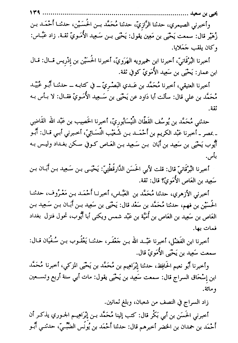 وَأَخْبَرَنَا أَبُو نُعيم الحافظ، حدثنا إبراهيم بن محمد بن يحيى المزكي، أخبرنا محمّد ابن إِسْحَاق السراج قَالَ: سمعتُ سَعِيد بْن يَحْيَى يَقُولُ: مات أبي سنة أربع وتسعين ومائة.