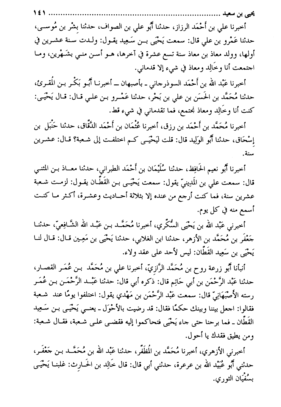 أخبرني الأزهري، أخبرنا محمّد بن المظفّر، حَدَّثَنَا عبد الله بن محمد بن جعفر، حدثني أبو عبيد الله بن عرعرة، حدَّثَنِي أبي قَالَ: قَالَ خَالِد بْن الحارث: غَلبنا يَحْيَى بسفيان الثوري.