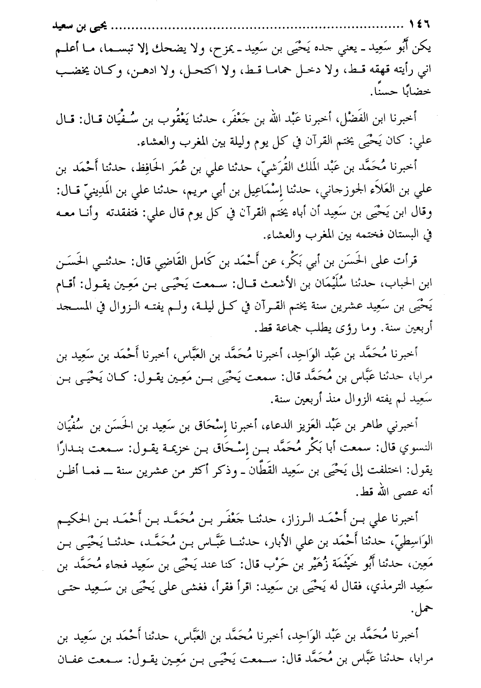 قرأتُ عَلَى الْحَسَن بن أبي بكر، عن أَحْمَد بْن كامل القاضي قَالَ: حدَّثَنِي الْحَسَن ابن الحباب، حَدَّثَنَا سُلَيْمَان بْن الأشعث قَالَ: سمعتُ يَحْيَى بْن مَعين يَقُولُ: أقام يَحْيَى بْن سَعِيد عشرين سنة يختم القرآن فِي كل ليلة، ولَم يفته الزَّوال فِي المسجد أربعين سنة. وما رُؤيَ يطلبُ جماعة قط.