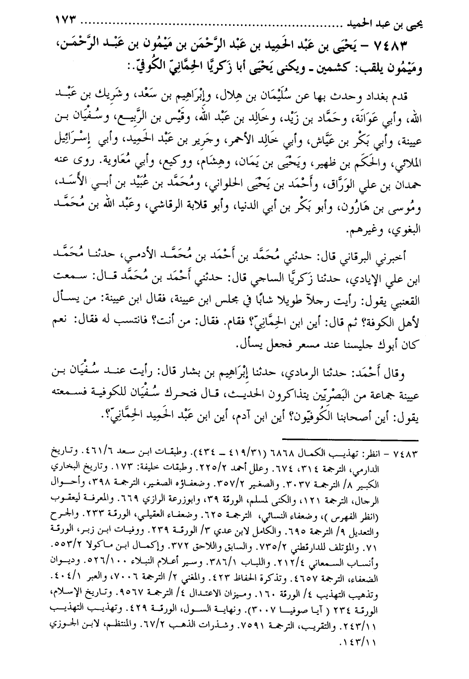 7483- يحيى بن عبد الحميد بن عبد الرحمن بن ميمون بْن عَبْد الرَّحْمَن، وميمون يُلقب: كشمين- ويُكنَى يَحْيَى أَبَا زكريا الحمَّاني الْكُوفيّ. [1] :