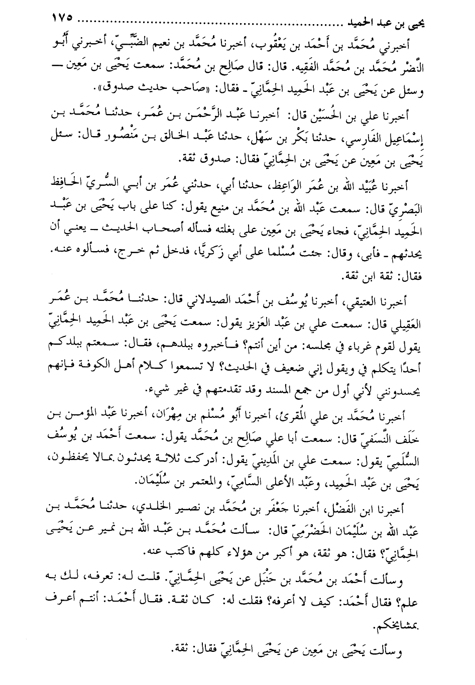 أخبرني محمّد بن أحمد بن يعقوب، أخبرنا محمّد بن نعيم الضّبّيّ، أَخْبَرَنِي أَبُو النضر مُحَمَّد بْن مُحَمَّد الفقيه. قَالَ: قَالَ صالِح بْن مُحَمَّد: سمعتُ يَحْيَى بْن معين- وسئل عَن يَحْيَى بْن عَبْد الحميد الحماني- فقال: «صاحب حديث صدوق» .