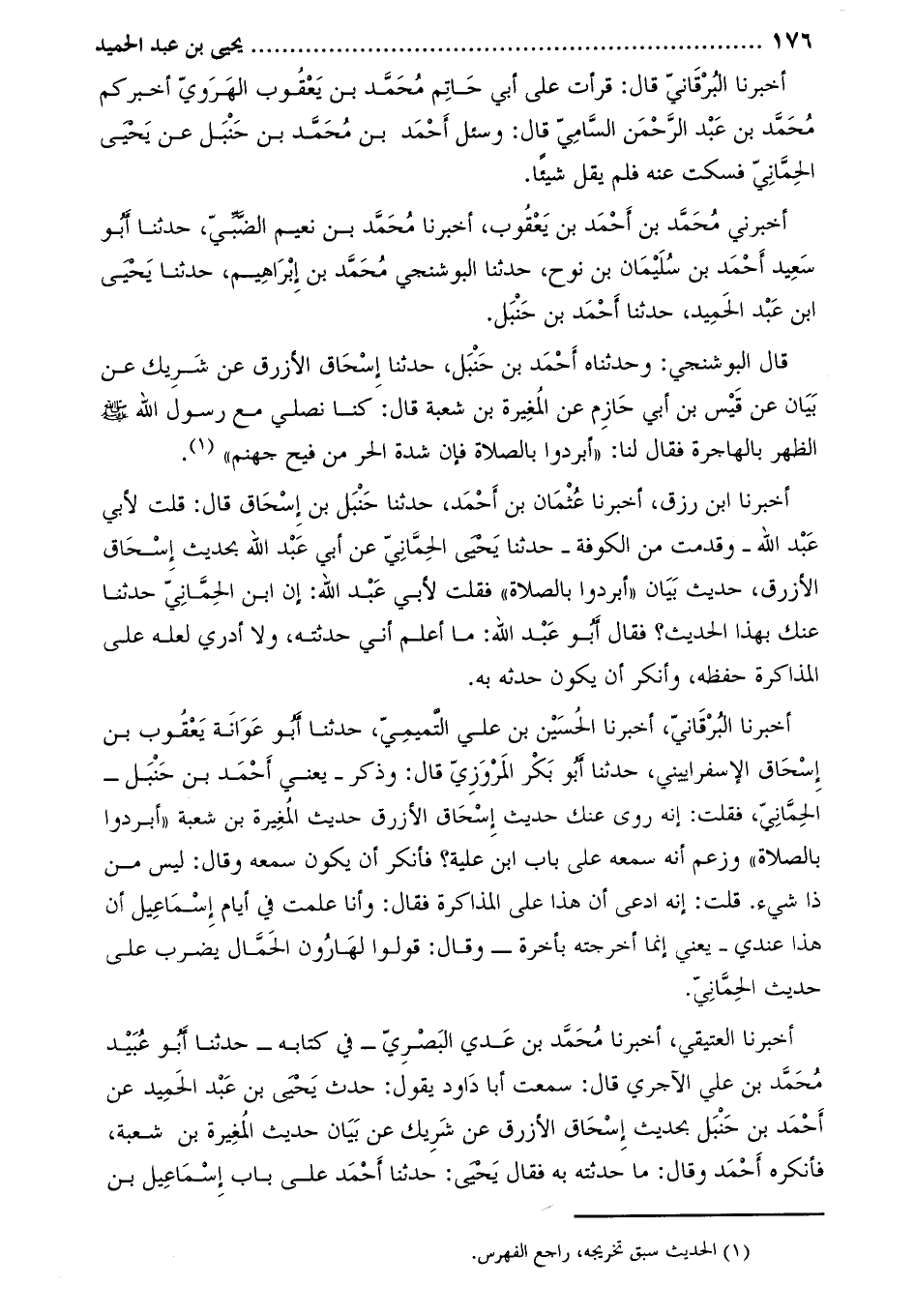 أَخْبَرَنَا ابْنُ رزق، أخبرنا عثمان بن أحمد، حَدَّثَنَا حَنْبَلُ بْنُ إِسْحَاقَ قَالَ: قُلْتُ لأَبِي عبد الله- وقدمت من الكوفة- حدثنا يَحْيَى الْحِمَّانِيُّ عَنْ أَبِي عَبْدِ اللَّهِ بِحَدِيثِ إسحاق الأزرق، حديث بيان «أَبْرِدُوا بِالصَّلاةِ» فَقُلْتُ لأَبِي عَبْدِ اللَّهِ: إِنَّ ابْنَ الْحِمَّانِيِّ حَدَّثَنَا عَنْكَ بِهَذَا الْحَدِيثِ؟ فَقَالَ أَبُو عَبْدِ اللَّهِ: مَا أَعْلَمُ أَنِّي حَدَّثْتُهُ، وَلا أَدْرِي لَعَلَّهُ عَلَى الْمُذَاكَرَةِ حَفِظَهُ، وَأَنْكَرَ أن يكون حدثه به.