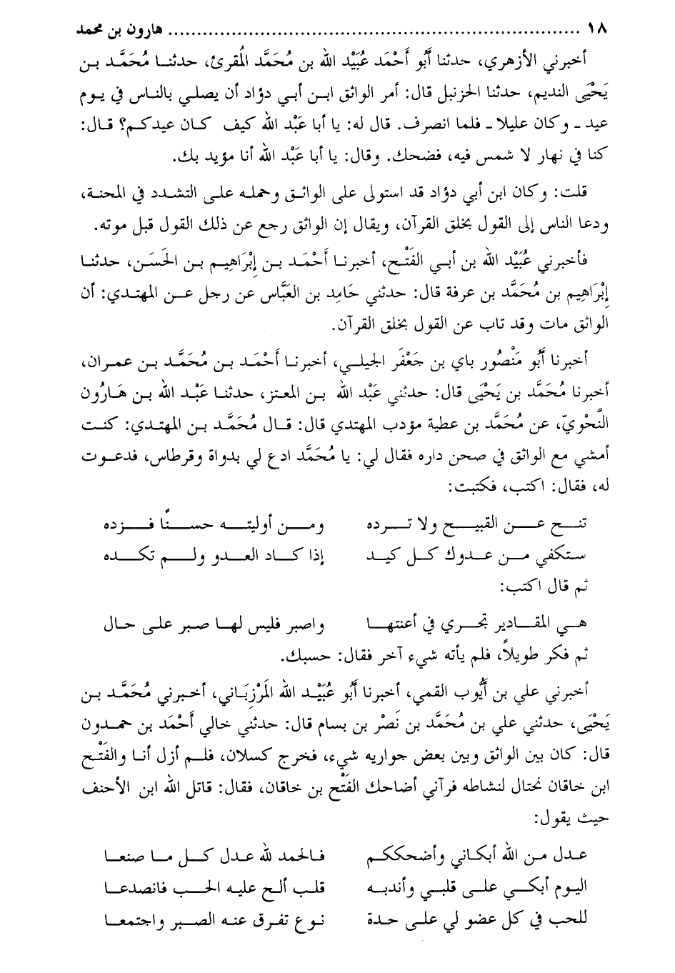 أَخْبَرَنَا أبو منصور باي بن جعفر الجيلي، أخبرنا أحمد بن محمّد بن عمران، أَخْبَرَنَا مُحَمَّد بن يَحْيَى قَالَ: حَدَّثَنِي عَبْد الله بن المعتز، حَدَّثَنَا عبد الله بن هارون النحوي، عن محمد بن عطية مؤدب المهتدي قال: قال محمّد بن المهتدي: كنت أمشي مع الواثق في صحن داره فقال لي: يا محمد ادع لي بدواة وقرطاس، فدعوت له، فقال: اكتب، فكتبت: