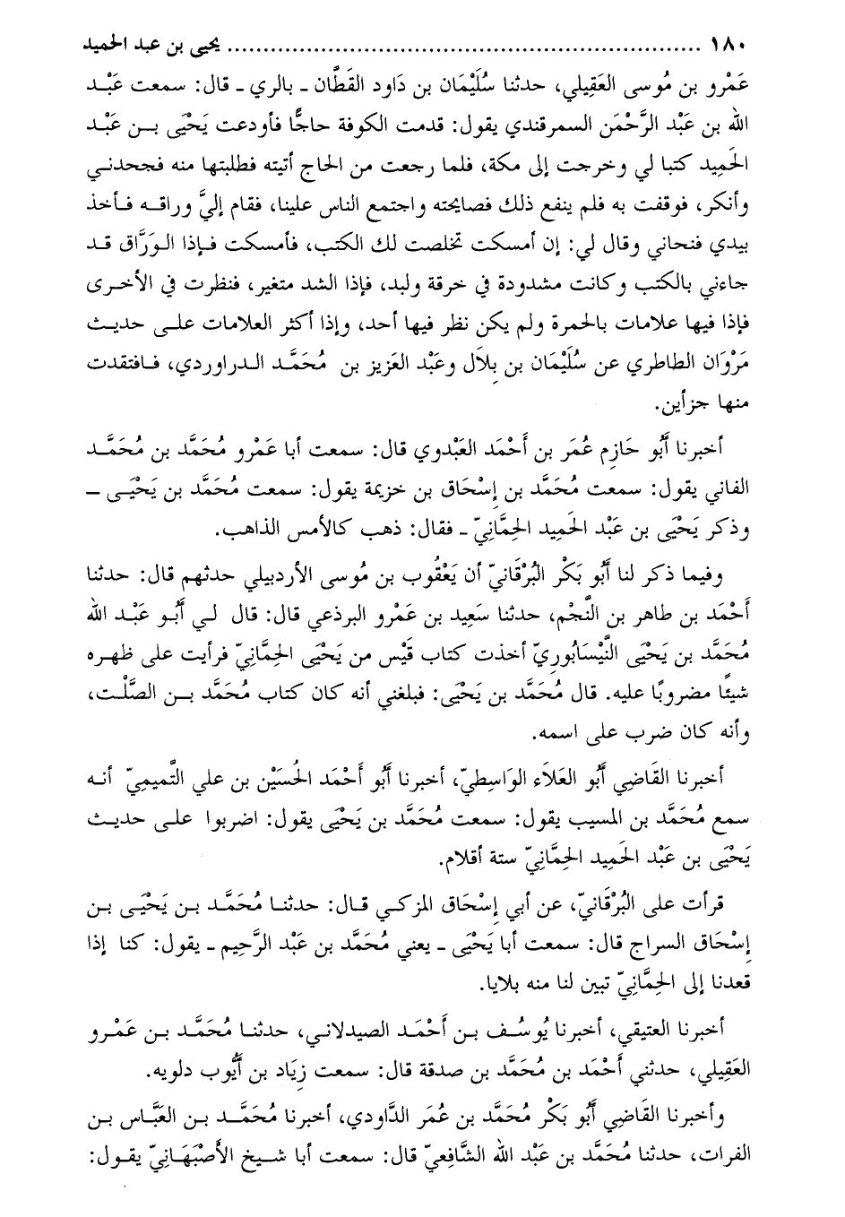 قرأت على البرقاني، عن أبي إسحاق المزكي قال: حدثنا محمّد بن يحيى بْن إِسْحَاق السراج قَالَ: سمعت أبا يَحْيَى- يعني مُحَمَّد بْن عَبْد الرحيم- يَقُولُ: كُنَّا إذا قعدنا إلى الحماني تبيّن لنا منه بلايا.