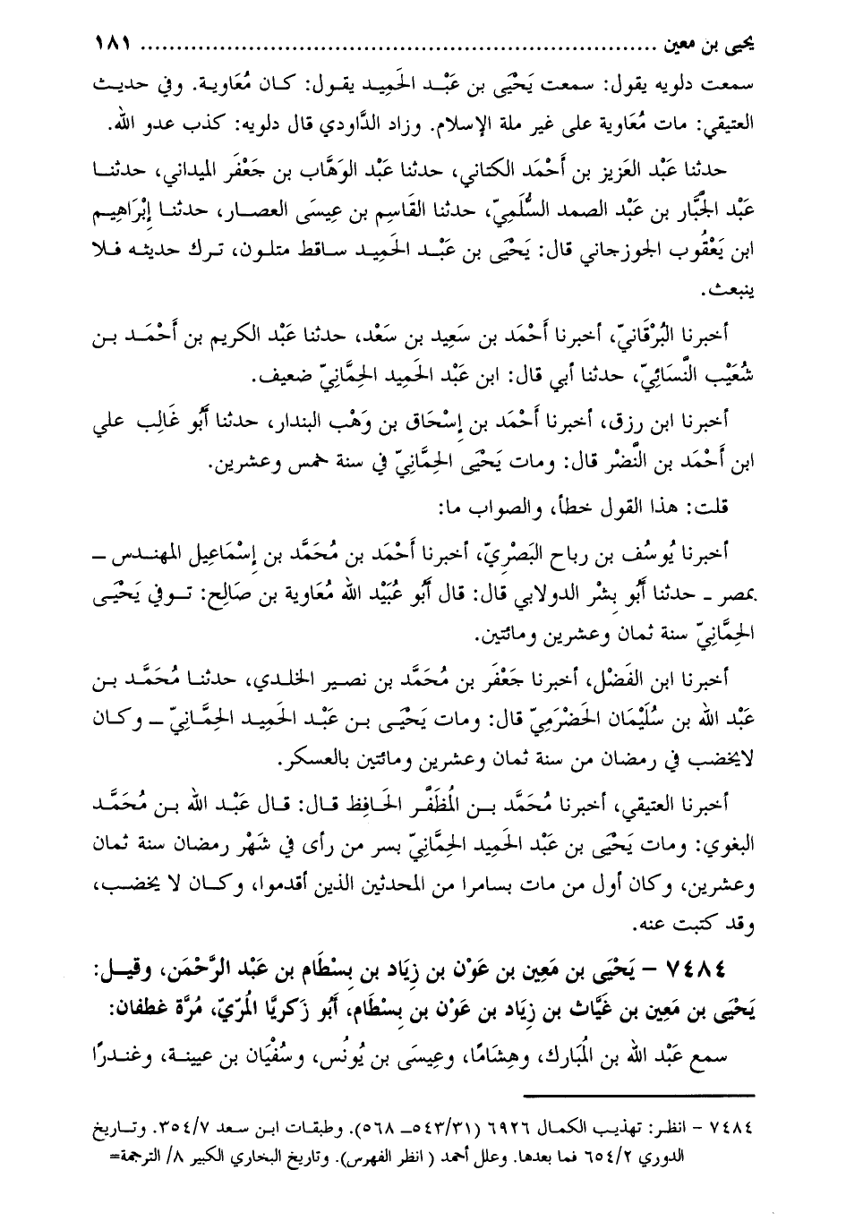 7484- يَحْيَى بْنُ مَعِينِ بْنِ عَوْنِ بْنِ زِيَادٍ بن بسطام بن عبد الرحمن، وقيل: يحيى بن معين بن غياث بن زياد بن عون بن بسطام، أبو زكريا المري، مرة غطفان: [1]