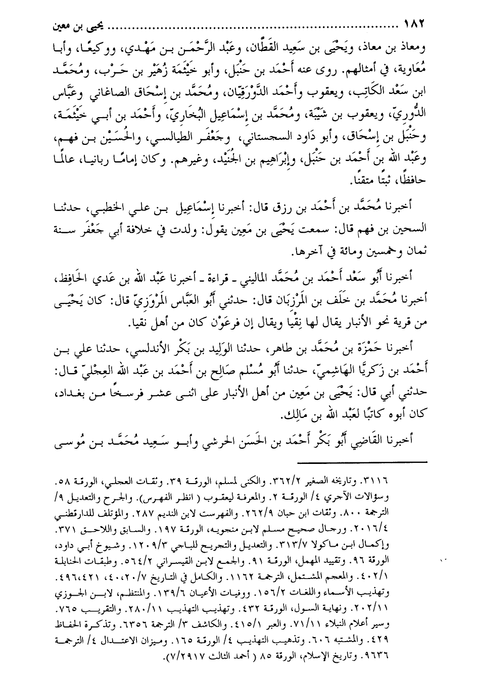 أَخْبَرَنَا مُحَمَّد بْن أَحْمَد بْن رزق قال: أخبرنا إسماعيل بن علي الخطبي، حَدَّثَنَا الْحُسَيْن بْن فَهْم قَالَ: سمعتُ يَحْيَى بْن معين يَقُولُ: ولدت فِي خلافة أبي جَعْفَر سنة ثَمان وخَمْسين ومائة فِي آخرها.