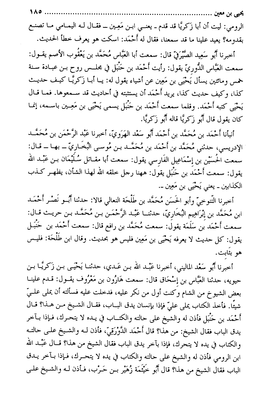 سمعتُ الْعَبَّاس الدوري يَقُولُ: رأيتُ أَحْمَد بْن حنبل فِي مجلس رَوْح بْن عُبادة سنة خمس ومائتين يسأل يَحْيَى بْن معين عَن أشياء يَقُولُ لَهُ: يا أَبَا زكريا كيف حديث كذا، وكيف حديث كذا، يريد أَحْمَد أن يستثبته فِي أحاديث قد سمعوها. فما قَالَ يَحْيَى كتبه أَحْمَد. وقلما سمعتُ أَحْمَد بْن حنبل يُسمي يَحْيَى بْن معين باسمه، إنّما كَانَ يَقُولُ قَالَ أَبُو زكريّا قاله أَبُو زكريا.