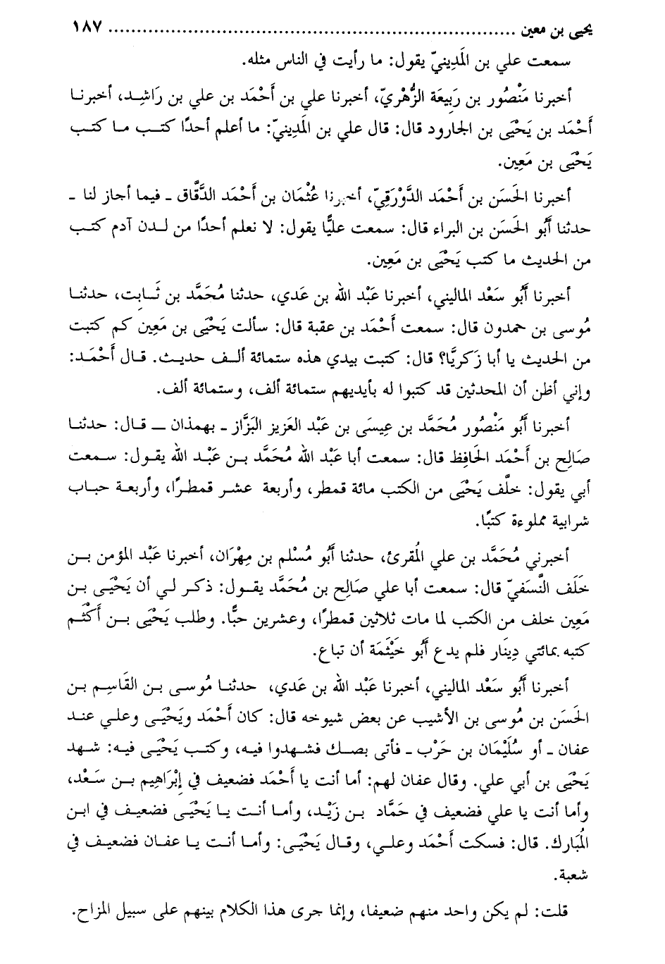 أخبرنا منصور بن ربيعة الزّهريّ، أَخْبَرَنَا عَلِيُّ بْنُ أَحْمَدَ بْنِ عَلِيِّ بْنِ راشد، أَخْبَرَنَا أَحْمَد بْن يَحْيَى بْن الجارود قَالَ: قال علي بن الْمَدِينِيّ: ما أعلم أحدًا كتب ما كتب يَحْيَى بْن معين.