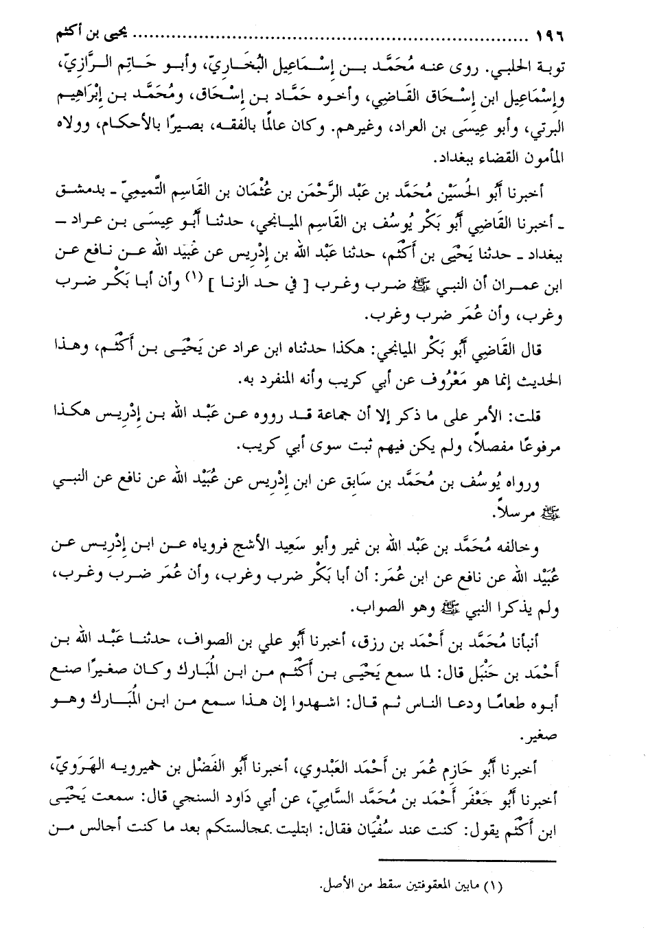 أَخْبَرَنَا أَبُو الْحُسَيْنِ مُحَمَّدُ بْنُ عَبْدِ الرَّحْمَنِ بْنِ عُثْمَانَ بْنِ الْقَاسِمِ التَّمِيمِيُّ- بدمشق- أَخْبَرَنَا الْقَاضِي أَبُو بَكْرٍ يُوسُفُ بْنُ الْقَاسِمِ الميانجي، حدثنا أبو عيسى بن عراد- ببغداد- حدثنا يحيى بن أكثم، حَدَّثَنَا عَبْدُ اللَّهِ بْنُ إِدْرِيسَ عَنْ عُبَيْدِ اللَّهِ عَنْ نَافِعٍ عَنِ ابْنِ عِمْرَانَ أَنَّ النَّبِيَّ صَلَّى اللَّهُ عَلَيْهِ وَسَلَّمَ ضَرَبَ وغرب [في حد الزنا] [1] وَأَنَّ أَبَا بَكْرٍ ضَرَبَ وَغَرَّبَ، وَأَنَّ عُمَرَ ضَرَبَ وَغَرَّبَ.