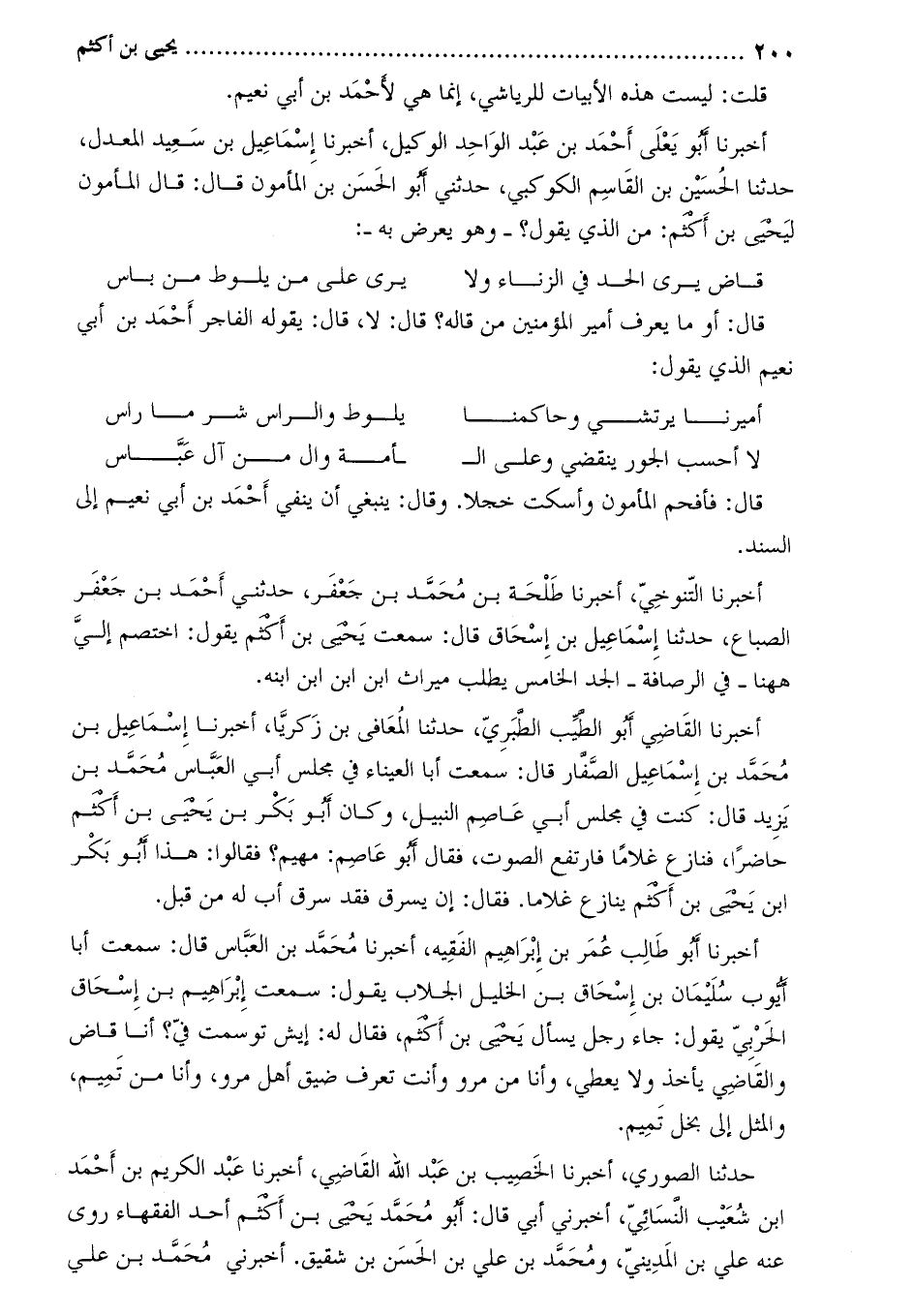 أَخْبَرَنَا التنوخي، أخبرنا طلحة بن محمّد بن جعفر، حدثني أحمد بن جعفر الصباع، حَدَّثَنَا إِسْمَاعِيل بْن إِسْحَاق قَالَ: سمعتُ يَحْيَى بن أكثم يقول: اختصم إليّ هاهنا- فِي الرُّصافة- الجد الخامس يطلبُ ميراث ابن ابن ابن ابنه.