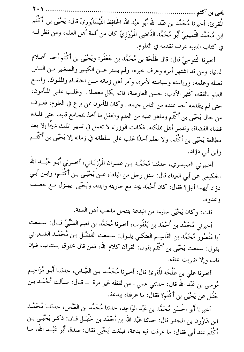 المقرئ، أَخْبَرَنَا مُحَمَّد بْن عَبْد الله أَبُو عَبْد الله الحافظ النيسابوري قَالَ: يَحْيَى بْن أكثم ابن مُحَمَّد التميمي أَبُو مُحَمَّد القاضي الْمَرْوَزِيّ كَانَ من أئمة أهل العلم، ومن نَظر لَهُ فِي كتاب التنبيه عرف تقدمه فِي العلوم.