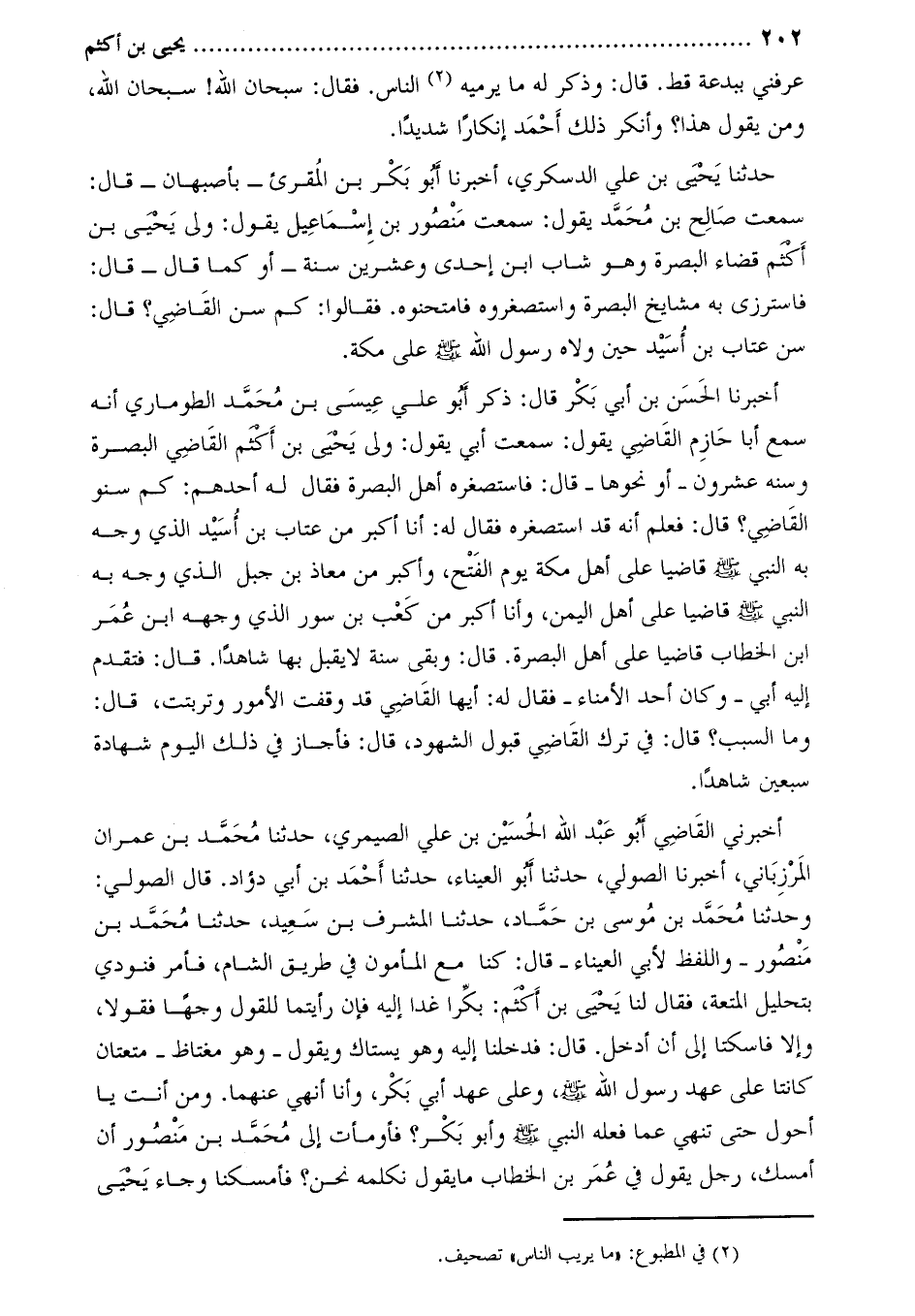 سمعتُ صالِح بْن مُحَمَّد يَقُولُ: سمعتُ منصور بْن إِسْمَاعِيل يَقُولُ: وَلِي يَحْيَى بْن أكثم قضاء البصرة وهو شابٌ ابن إحدى وعشرين سنة- أو كما قَالَ- قَالَ: