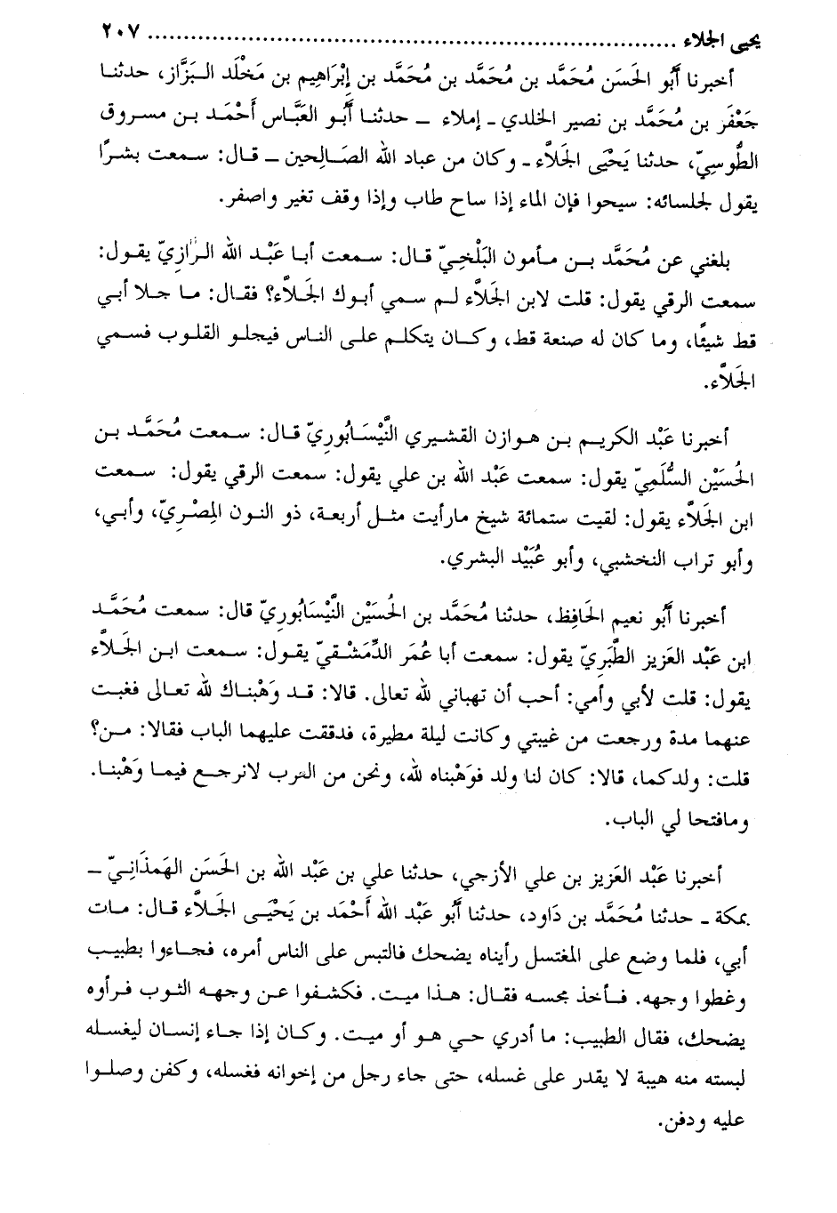 أخبرنا عبد العزيز بن علي الأزجي، حَدَّثَنَا عَلِيّ بْن عَبْد اللَّه بْن الْحَسَن الهمذانيّ- بمكة- حدثنا محمّد بن داود، حَدَّثَنَا أَبُو عَبْدِ اللَّهِ أَحْمَدُ بْنُ يَحْيَى الجلاء قَالَ: مات أبي، فلما وضع عَلَى المغتسل رأيناهُ يضحك فالتبس عَلَى الناس أمره، فجاءوا بطبيب وغطوا وجهه. فأخذ مجسه فقال: هذا ميت. فكشفوا عَن وجهه الثوب فرأوه يضحك، فقال الطبيب: ما أدري حي هُوَ أو ميت. وكان إذا جاء إنسان ليغسله لبسته منه هيبة لا يقدرُ عَلَى غسله، حتى جاء رجلٌ من إخوانه فغسله، وكُفن وصلوا عَلَيْهِ ودفن.